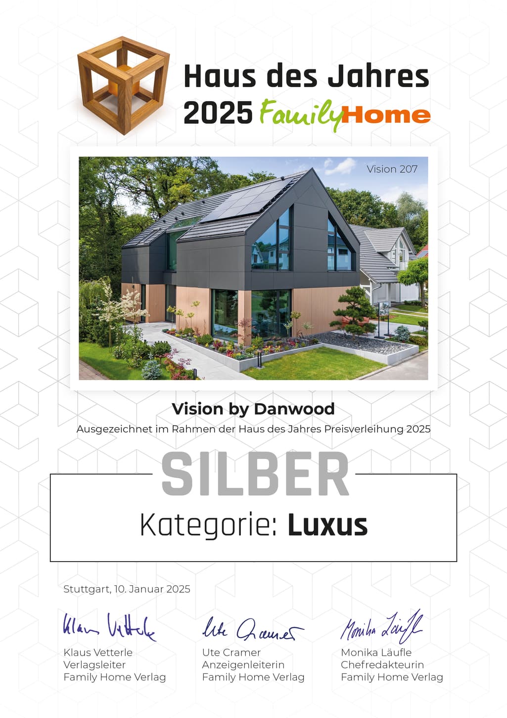Danwood trat in der Kategorie Luxus an und überzeugte mit dem Fertighaus „Vision by Danwood 207“, das mit Silber prämiert wurde! Dieses moderne Modell beweist, dass sich Luxus und nachhaltiges Bauen nicht ausschließen. Mit seiner innovativen Bauweise, hochwertigen Ausstattung und zeitlosen Architektur setzt das Vision by Danwood 207 neue Maßstäbe im Luxussegment. Es vereint höchsten Wohnkomfort mit umweltfreundlichen und smarten Technologien und beweist, dass modernes Design nachhaltig ist.
