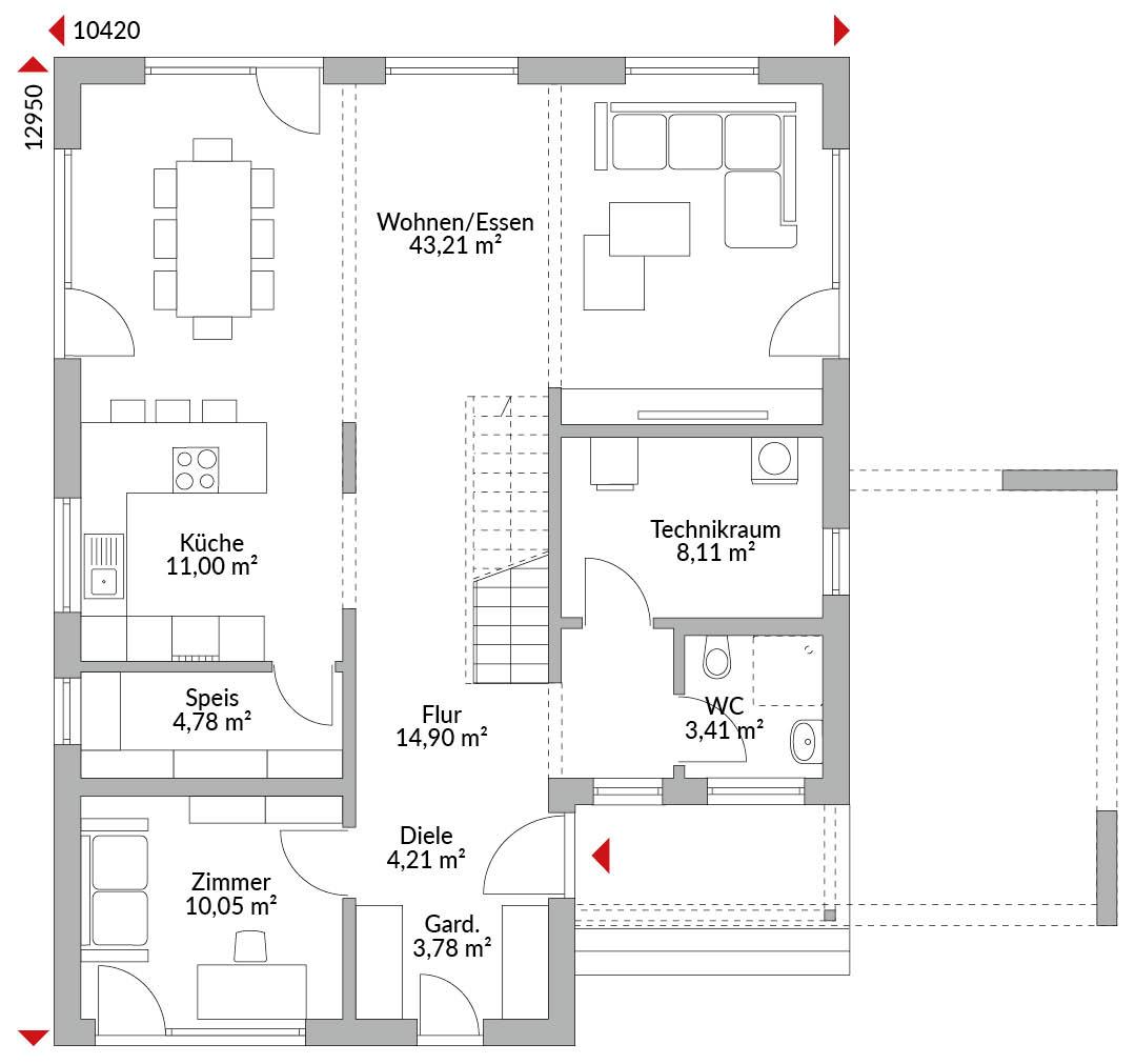 Zweigeschossige Stadtvilla mit vier Zimmern, offener Küche, Speisekammer, geräumigem Wohn-/Essbereich, Gäste-WC, Technikraum und Diele, Bad und einer Ankleide im Obergeschoss, Zeltdach mit 22° Dachneigung.