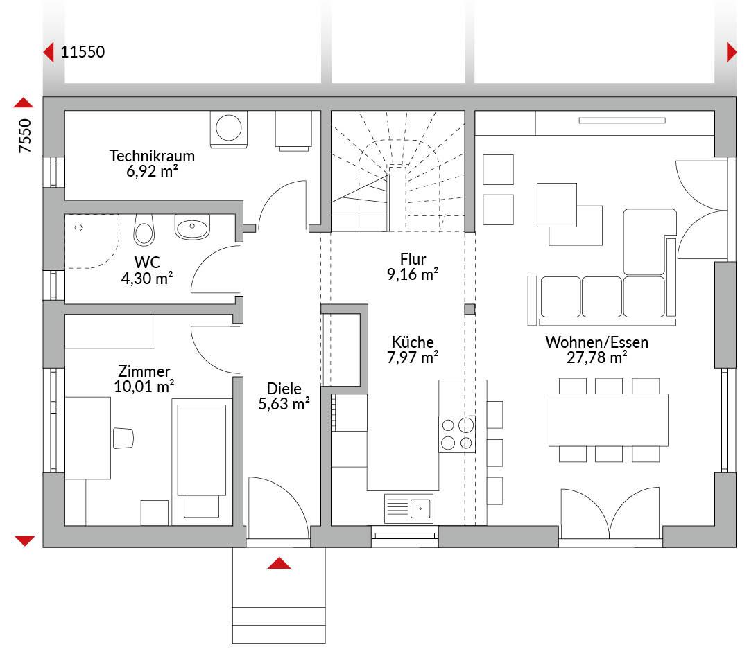 Zweigeschossige Doppelhaushälfte mit fünf Zimmern, Ankleide, Küche, Bad, Gäste-WC, Technikraum, Abstellraum und Diele. Walmdach mit 22° Dachneigung.