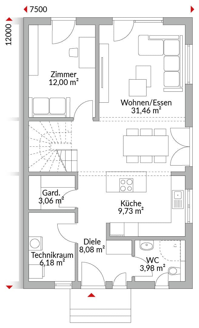 Eineinhalbgeschossige Doppelhaushälfte mit sechs Zimmern, Küche, Bad, Gäste-WC, Technikraum und Diele. Satteldach mit 30° Dachneigung, Kniestock 1,50 m. Zwei große Flachdachgauben.