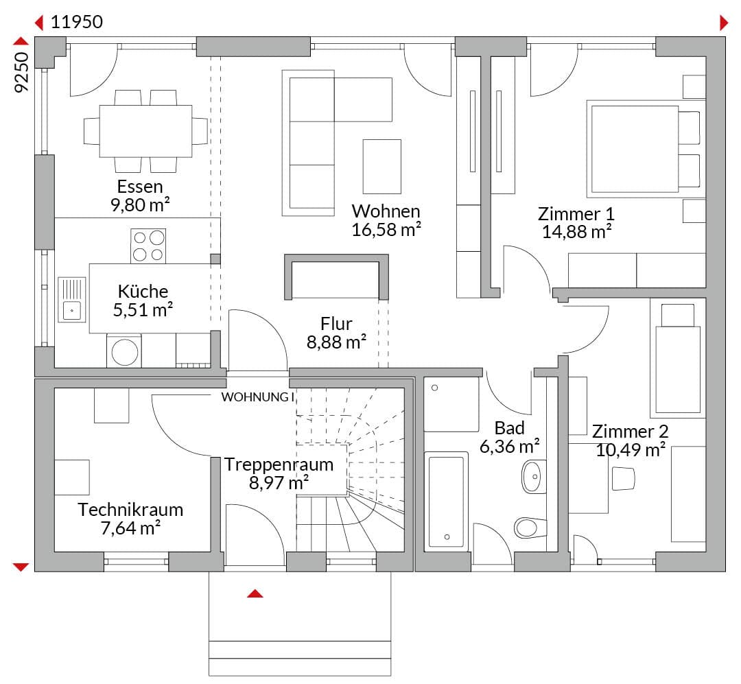 Gemeinsamer Zugang zu den Wohnungen, Treppenhaus und Technikraum für Wohnung 1+2 in gemeinsamer Diele.
