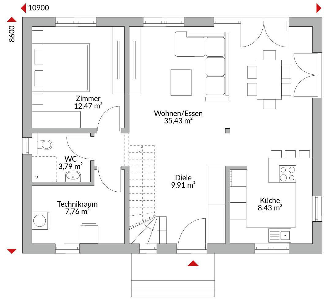 Eineinhalbgeschossiges Haus mit vier Zimmern, offener Küche, Bad, Gäste-WC, Technikraum, Diele und Flur. Satteldach mit 45° Dachneigung, Kniestock 0,75 m.