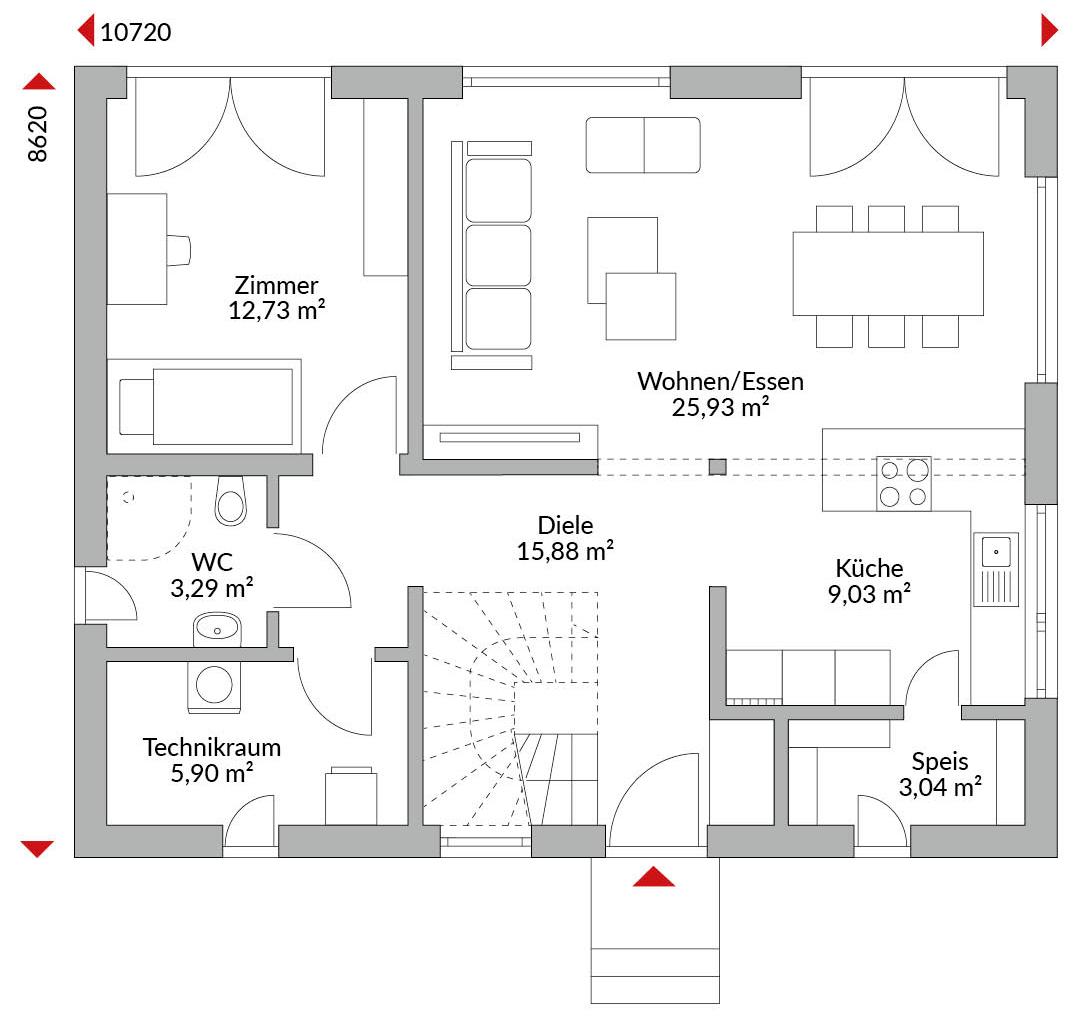 Eineinhalbgeschossiges Haus mit zwei Zwerchgiebeln, fünf Zimmern, Ankleide, offener Küche, Speisekammer, Bad, Gäste-WC, Technikraum und Diele, Satteldach mit 40° Dachneigung (Zwerchgiebel 35°), Kniestock 1,00 m.