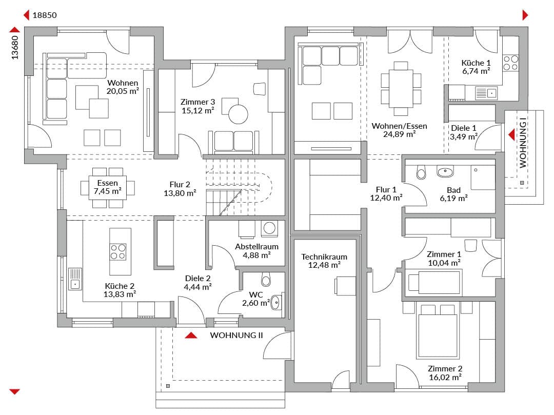 Zweigeschossiges Stadthaus mit zwei getrennten Wohnungen und separaten Zugängen. Externer Zugang zum gemeinsamen Technikraum. Walmdach mit 22° Dachneigung.