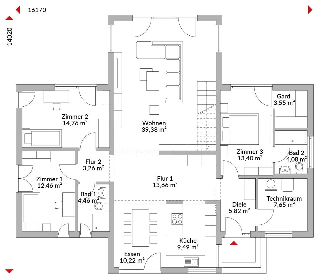 Bungalow mit 4 Zimmern und Galerie, Ankleide, offener Küche, 2 Bädern, Gäste-WC, Diele, großem Flur und Technikraum. Satteldach/Pultdach 20° Dachneigung.