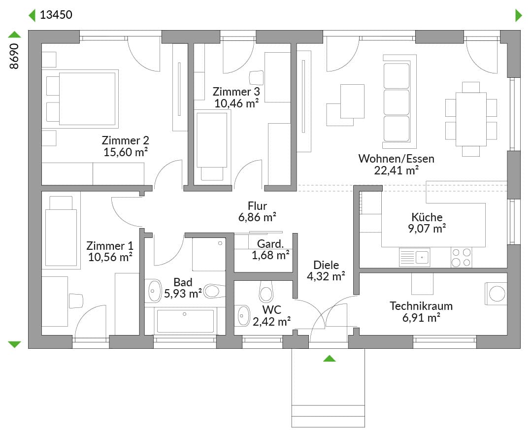 Drei Grundrissvarianten stehen zur Wahl… In jedem Falle ist man mit diesem Bungalow im Alter oder als Kleinfamilie up-to-date. Die durchdachten Raumaufteilungen gewährleisten individuelle Freiräume eines jeden Bewohners genauso wie die vielfältigen Möglichkeiten, mit Freunden und Familie zusammen zu sein. Bis zu drei Zimmer zur individuellen Verfügung ermöglichen auch ein Homeoffice, Platz für Hobbys oder Gästezimmer. Bodentiefe Fenster schaffen schöne Blickachsen in den Garten.