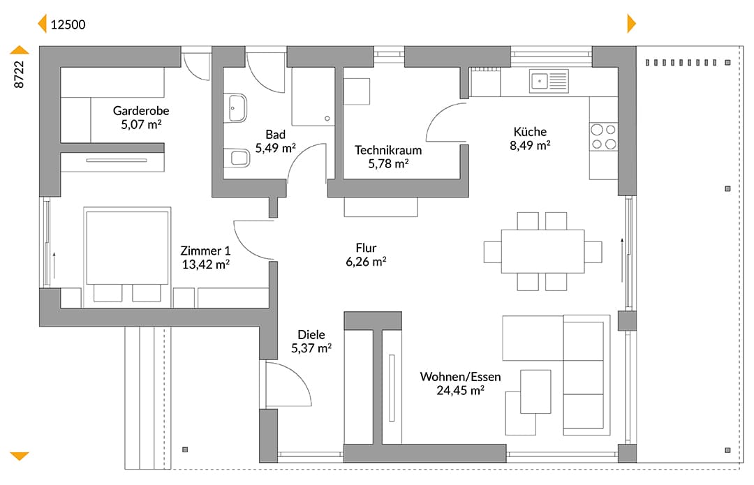 NEXT Wood 75FT verlängert Ihre Outdoor-Saison: Eine ganze Hausseite ist großzügig überdacht und schützt Ihren Terrassenplatz nicht nur vor zu viel Sonne, sondern auch vor kurzen Regenschauern. Sitzpolster können hier übernachten und Terrassenmöbel überwintern. Und falls Sie Ihr Flachdach begrünen möchten, ist das ein kleiner, aber schöner Beitrag zum Klimaschutz.