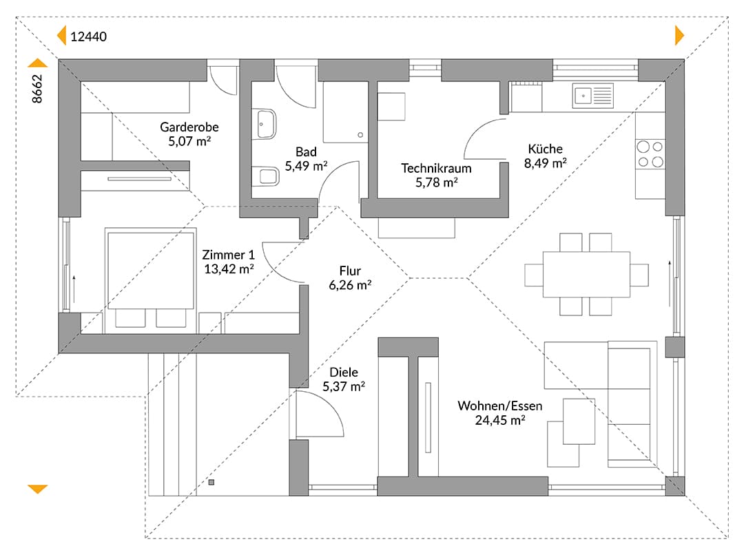 Modern und dennoch von traditioneller Bauweise inspiriert, zeigt sich NEXT Wood 75W mit dem markanten Walmdach. Das bietet beachtliche Lagerfläche unter dem Dach für all die Dinge, die man nur saisonal benötigt. Der breite Dachüberstand schützt die Fassade vor Witterungseinflüssen und ist zugleich ein guter Hitzeschutz im Sommer. Eine große, auf einem Pfeiler ruhende Eingangsüberdachung ist integriert.