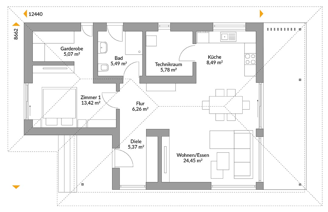 Ganz pur präsentiert sich NEXT 80F mit seinem Flachdach. Durch die raumhohen Fenster kann das Tageslicht die Räume fluten, und Sonnenanbeter finden auf der Terrasse ihr Paradies. Das flache Dach lässt sich auch begrünen, so dass Sie sich ein eigenes Mikroklima schaffen.
