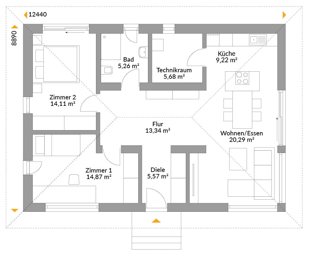 NEXT Wood 88W bedient den Wunsch nach einem modernen Haus mit einem „richtigen“ Dach. In gewachsene Wohngebiete fügt sich der schmucke Bungalow dank seines Walmdaches unauffällig ein. Trotzdem unterscheidet er sich mit seinen raumhohen Fenstern, der gläserner Wand und der zeitgemäßen Fassade optisch von seinen älteren Nachbarn – ganz zu schweigen vom seinem komfortablen Innenleben.