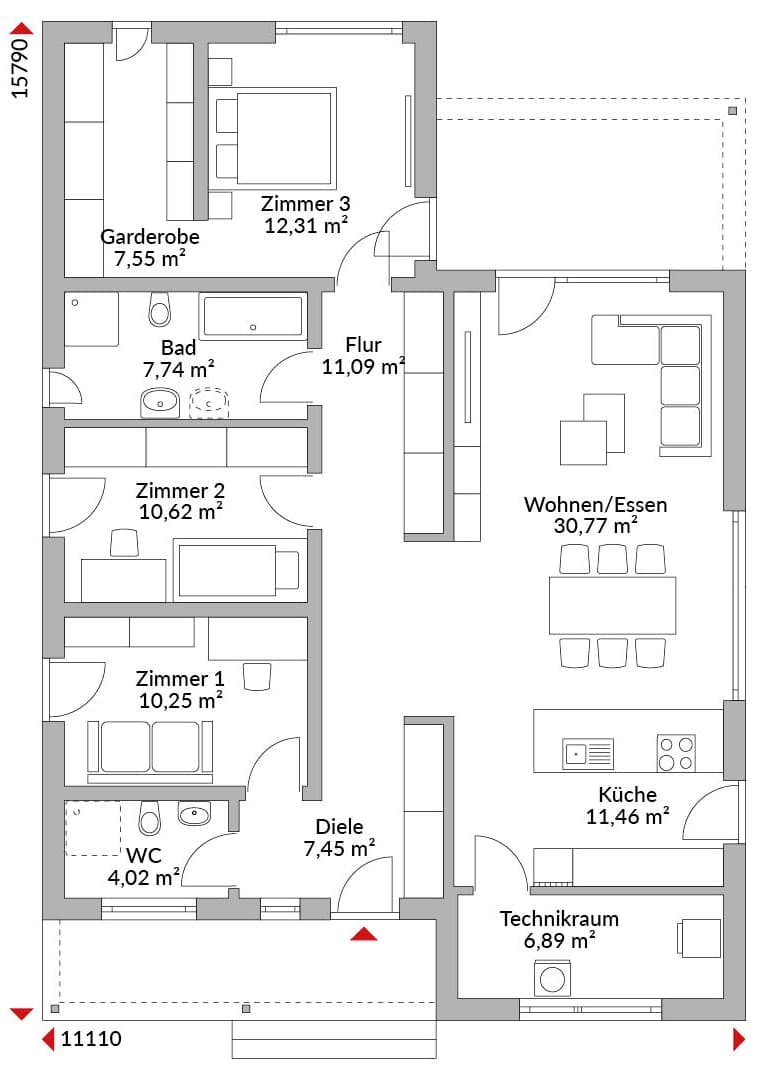 Winkelbungalow mit vier Zimmern, Ankleide, offener Küche, zwei Bädern, Gäste-WC, Speisekammer, Technikraum, Flur und großer Diele. Flachdach inkl. Haustür- und Terrassenüberdachung.