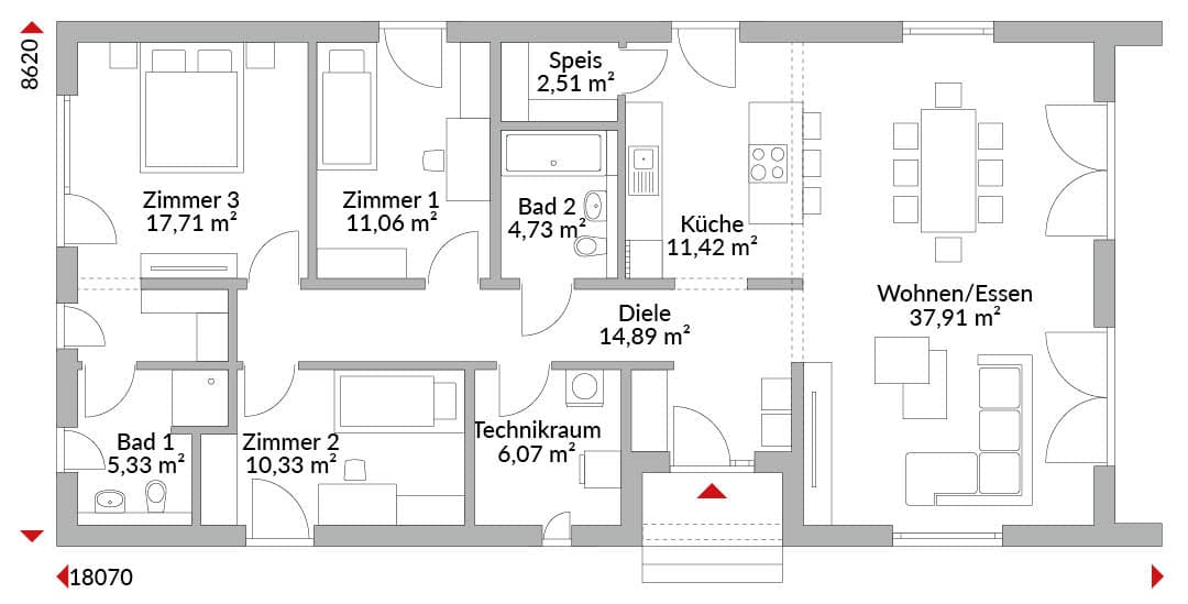 Bungalow mit 3 Zimmern, offener Küche, Speis, Bad, Gäste-WC, Diele, Garderobe, Ankleide und Technikraum. Satteldach mit 30° Dachneigung.