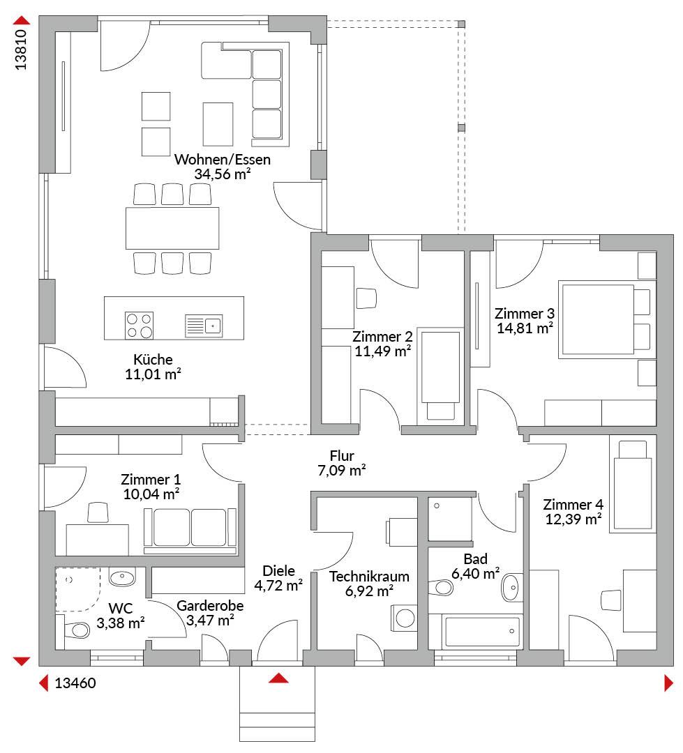 Winkelbungalow mit 5 Zimmern, offener Küche, Bad, Gäste-WC (Duschbad möglich), Diele/Garderobe und Technikraum. Walmdach mit 25° Dachneigung unkl. Terrassenüberdachung.