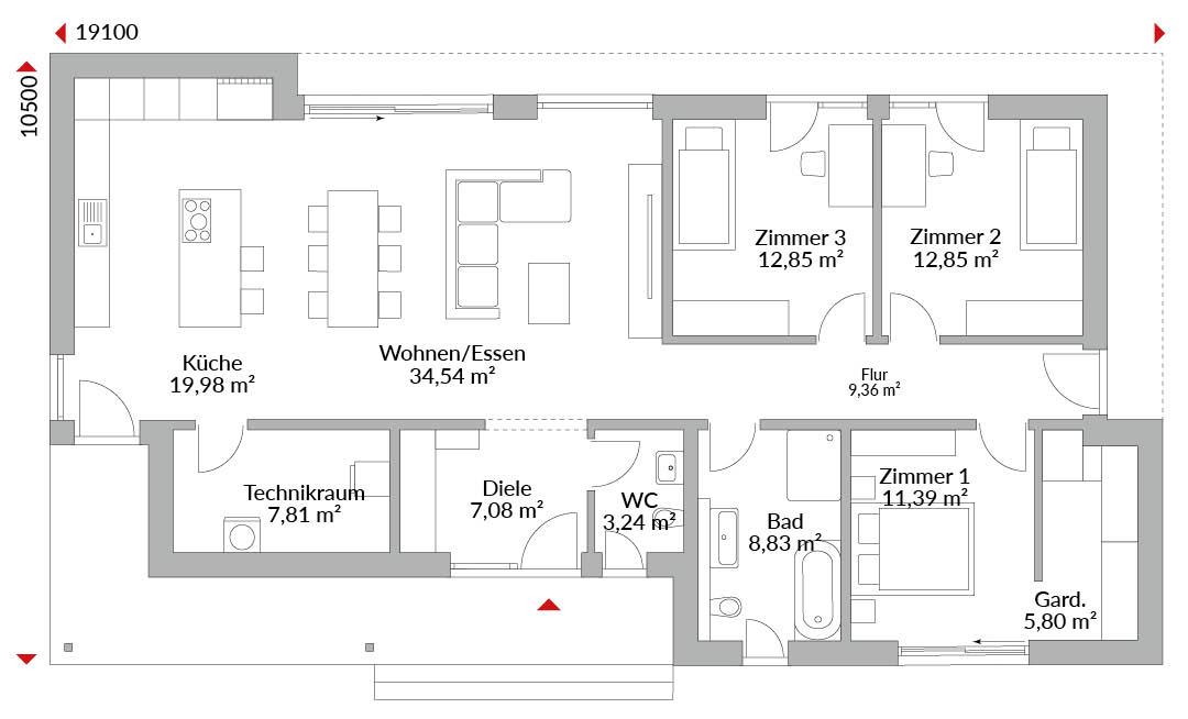Bungalow mit vollständig überdachtem Eingangsbereich und höherer Eingangstür mit Sichtfenster. Von außen zusätzlich direkter Zugang zur Küche. Das höhere Erdgeschoss mit seinen höheren Fenstern ist als offene Küche mit anschließendem Wohn-/Essbereich und Schiebetür zu Terrasse konzipiert. Walmdach ohne Dachüberstand, 25° Dachneigung.
