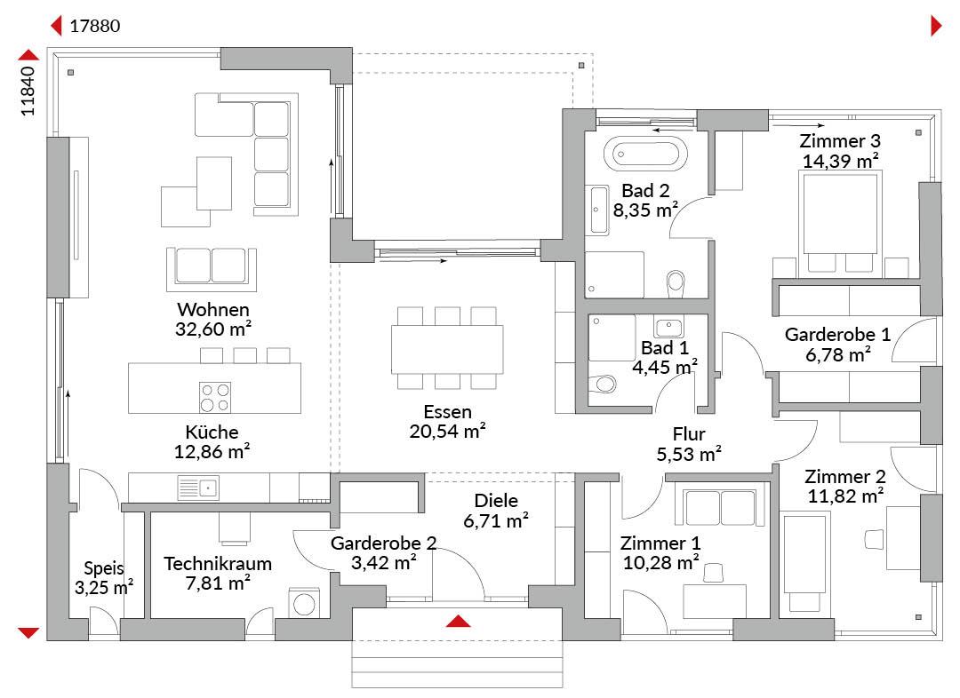 Winkelbungalow mit integrierter Eingangsüberdachung der höheren beidseitigen Sichtfenster-Haustür und drei Schlafzimmern. Hauptschlafzimmer mit Bad en Suite und freistehender Badewanne, Doppelwaschbecken sowie Dusche. Zwei separate Garderoben, davon eine als Ankleide nutzbar. Das erhöhte Wohngeschoss mit Eckverglasungen und höheren Fenstern ist als offene Küche / Wohnen/ Essen mit Schiebetüren zur Terrasse konzipiert. Speisekammer, Gäste-Bad mit Dusche, Technikraum und Diele, Flur. Walmdach mit breiter Traufe von 60 cm und 22° Dachneigung inklusive Terrassenüberdachung.