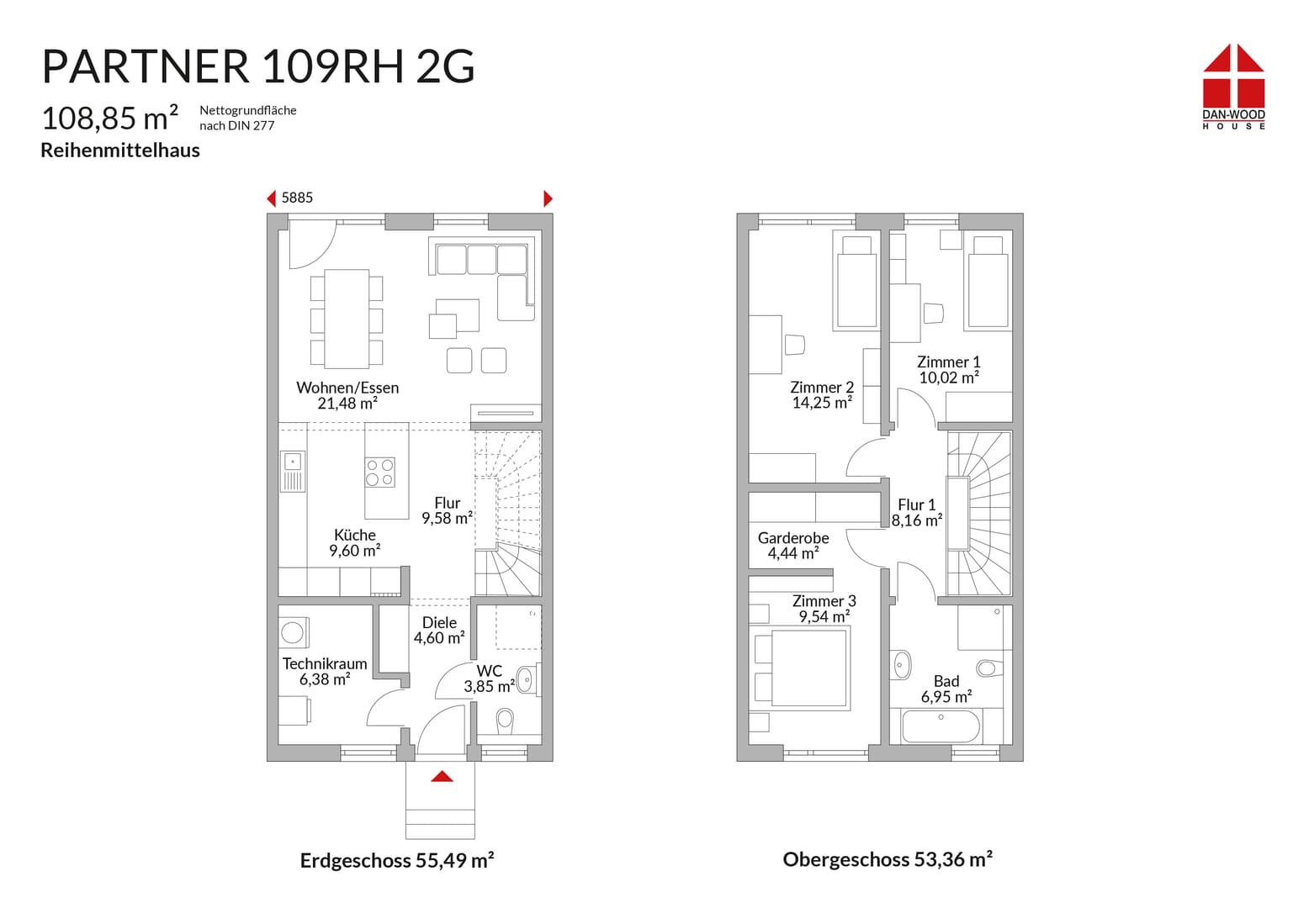 Zweigeschossiges Reihenhaus mit insgesamt drei Zimmern, eines mit begehbarer Garderobe, Wohnen/ Essen, Küche, Wannenbad mit Dusche, Gäste-WC, Technikraum, Diele, Flur und Garderobe. Walmdach.