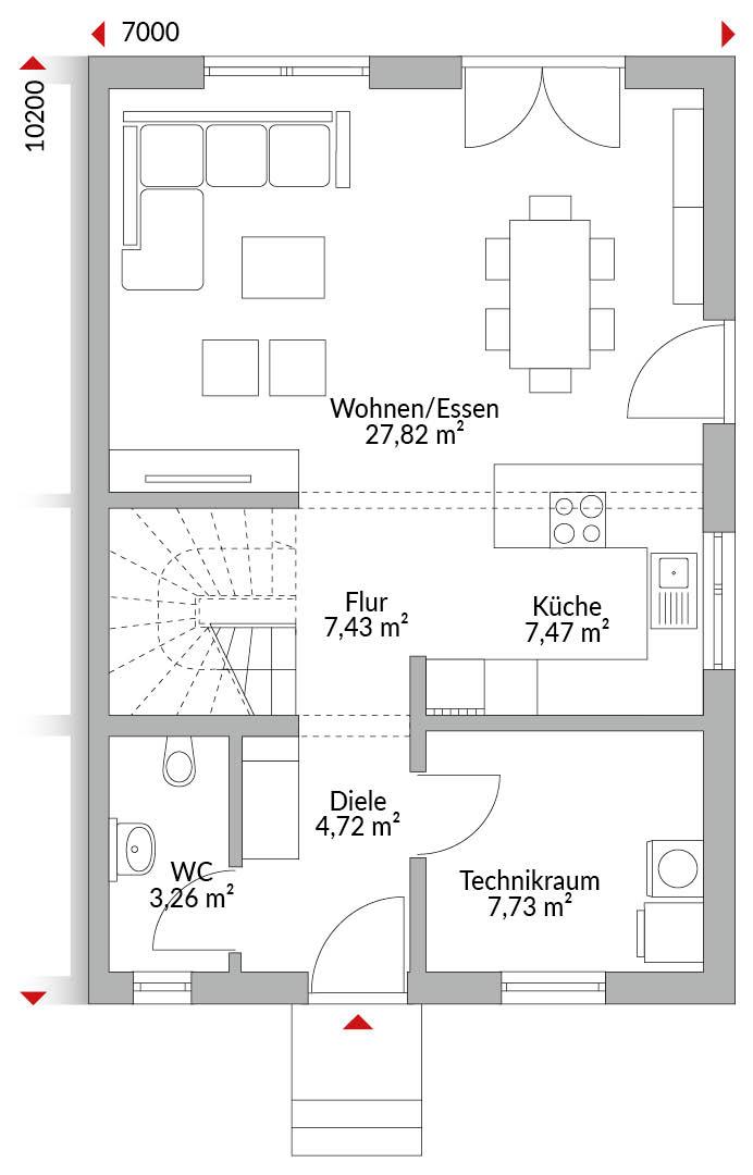 Zweigeschossige Doppelhaushälfte mit vier Zimmern, Ankleide, Küche, Bad, Gäste-WC, Technikraum und Diele. Walmdach mit 22° Dachneigung.