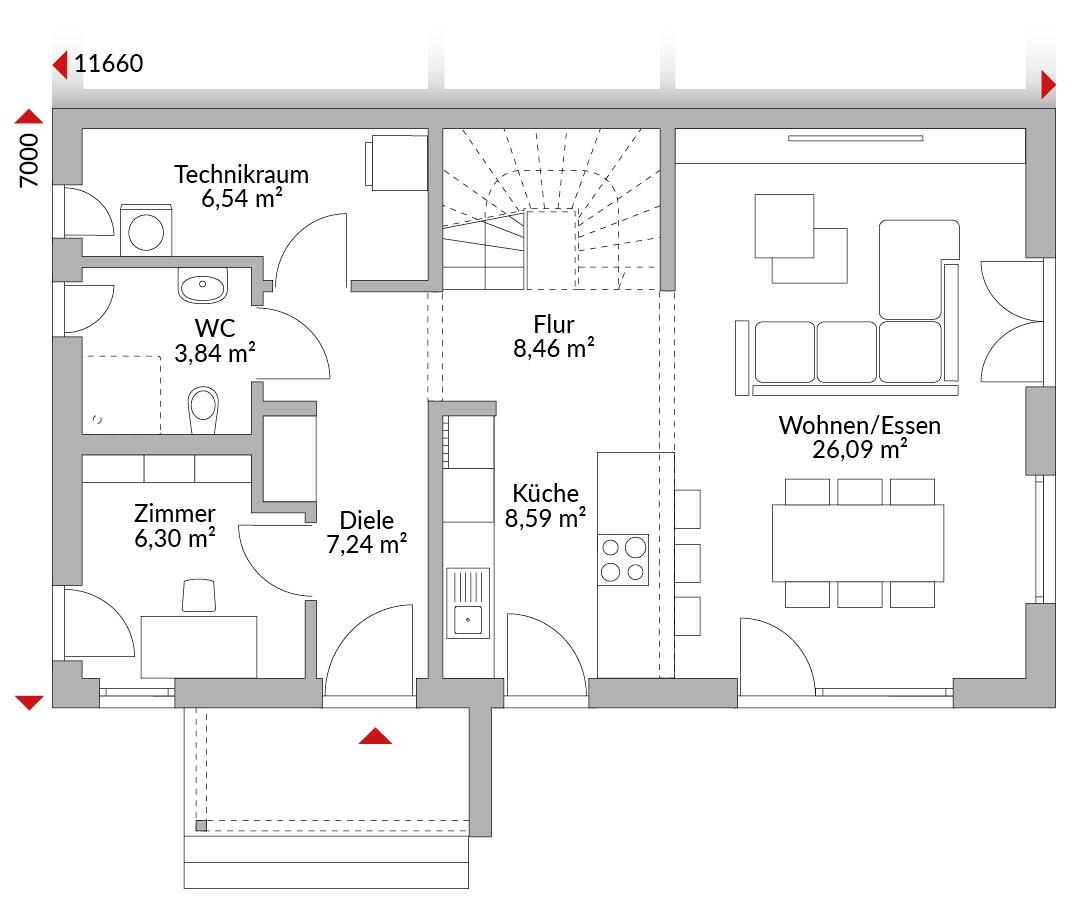 Doppelhaushälfte mit fünf Zimmern, Ankleide, Küche, Bad, Gäste-WC, Technikraum und Diele. Integrierte Flachdach-Eingangsüberdachung mit Seitenwand. Satteldach mit 25° Dachneigung, Kniestock 1,75 m und Flachdachgaube.