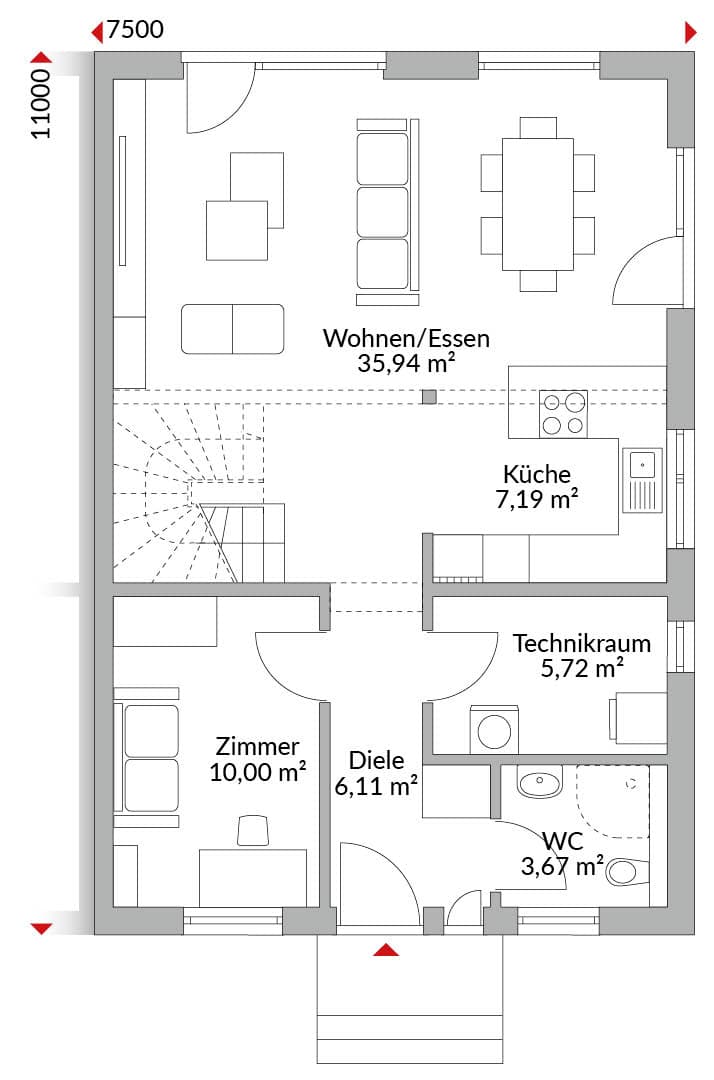 Eineinhalbgeschossige Doppelhaushälfte mit fünf Zimmern, , Küche, Bad, Gäste-WC, Technikraum und Diele. Satteldach mit 40° Dachneigung, Kniestock 1,00 m und Satteldachgaube.