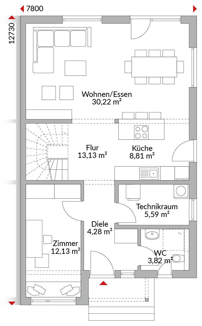 Doppelhaushälfte mit fünf Zimmern, Küche, großem Bad mit T-Lösung, Gäste-WC, Technikraum und Diele. Satteldach mit 30° Dachneigung, Kniestock 1,75 m. Vorspringender Baukörper mit Flachdach und integrierter Eingangsüberdachung sowie rückseitig eine Flachdachgaube.