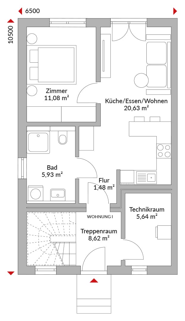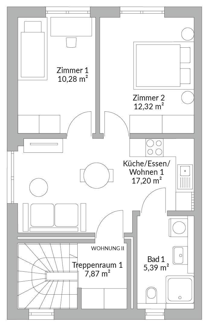 Der zweigeschossige Baukörper mit Walmdach öffnet die Wohnbereiche zur Gartenseite über großformatige Fensterflächen. Ein überdachter Terrassenbereich ergänzt den Außenraum. In beiden Wohnungen ist der offene Bereich Küche/Essen/Wohnen als Mittelpunkt geplant. Im Erdgeschoss befindet sich der gemeinsame Technikraum. Erschlossen werden die Wohnungen über ein gemeinsames Treppenhaus.