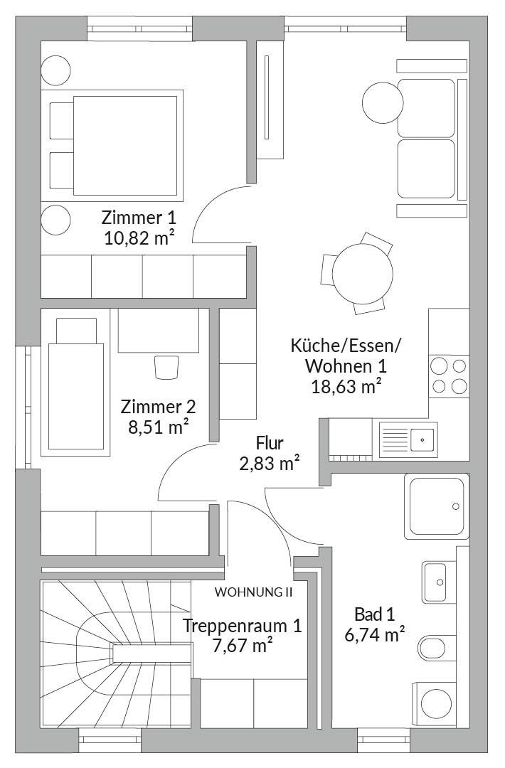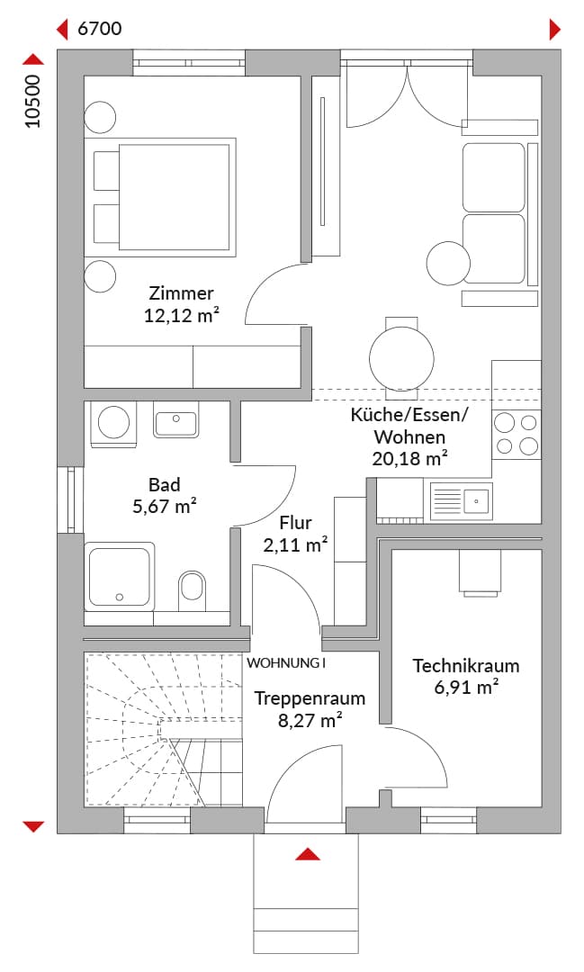 Das PARTNER PLUS 110W bietet zwei getrennte Wohneinheiten über Erdgeschoss und Dachgeschoss mit insgesamt 110,46 m² Nettogrundfläche (55,26 m² im Erdgeschoss, 55,20 m² im Dachgeschoss). Zwei separate Eingänge sorgen für eine klare Trennung und machen das Haus flexibel nutzbar, vom „Tür an Tür“-Wohnen bis zur Kombination aus Eigennutzung und Vermietung. Beide Wohnungen sind um den offenen Bereich Küche/Essen/Wohnen organisiert. Im Erdgeschoss ist zusätzlich ein Technikraum vorgesehen. Im Dachgeschoss kommt neben dem Wohnbereich eine Zimmerstruktur mit zwei Zimmern hinzu. Als architektonisches Extra ist eine Balkonlösung im Dachgeschoss dargestellt, die den Außenraum erweitert.
