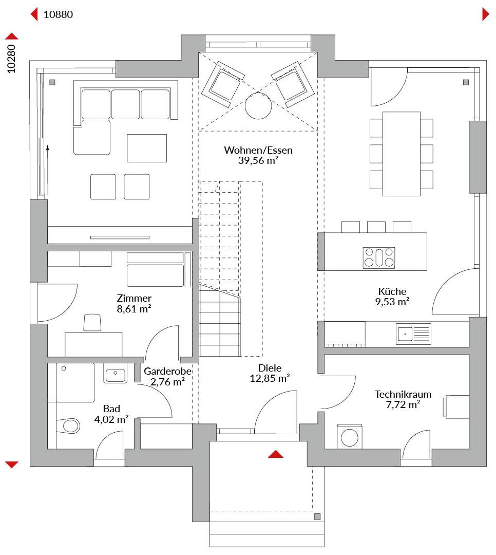 Eineinhalbgeschossiges Haus mit überdachtem Eingangsbereich der höheren Haustür. Beidseitig Giebelfenster im Obergeschoss. Kniestockfenster im Obergeschoss. Das höhere Erdgeschoss im Essbereich mit seinen höheren Fenstern ist als offene Küche zum unmittelbar anschließenden Wohn-Essbereich konzipiert - mit Eckverglasung im Essbereich und Schiebetüren zur Terrasse und in den Garten. Separates Studio für Gäste oder als Homeoffice. Drei Schlafzimmer, davon eines mit Bad en Suite und begehbarer Garderobe. Zusätzliches Duschbad sowie Gäste-WC. Technikraum, Diele und Flur. Satteldach mit breiter Traufe von 60 cm, 30° Dachneigung, Kniestock 1,75 m.