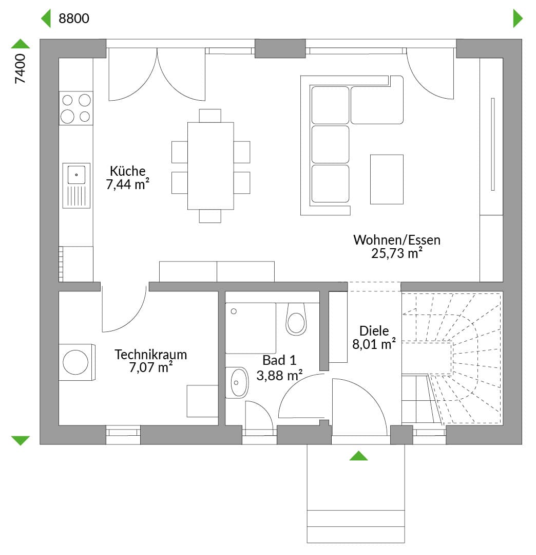 Erleben Sie das DAN-WOOD Family 103 – ein modernes Einfamilienhaus, das Komfort und Eleganz vereint. Mit seiner zeitlosen Architektur und großen Fensterfronten bietet es eine lichtdurchflutete, einladende Atmosphäre. Das Erdgeschoss überzeugt durch einen offenen Wohnbereich und eine moderne, großzügige Küche, ideal für gemeinsame Familienmomente. Im Obergeschoss finden sich drei geräumige Schlafzimmer, die jedem Familienmitglied Privatsphäre bieten. Zusätzliche Annehmlichkeiten wie ein Gäste-WC und ein Hauswirtschaftsraum sorgen für höchsten Wohnkomfort.