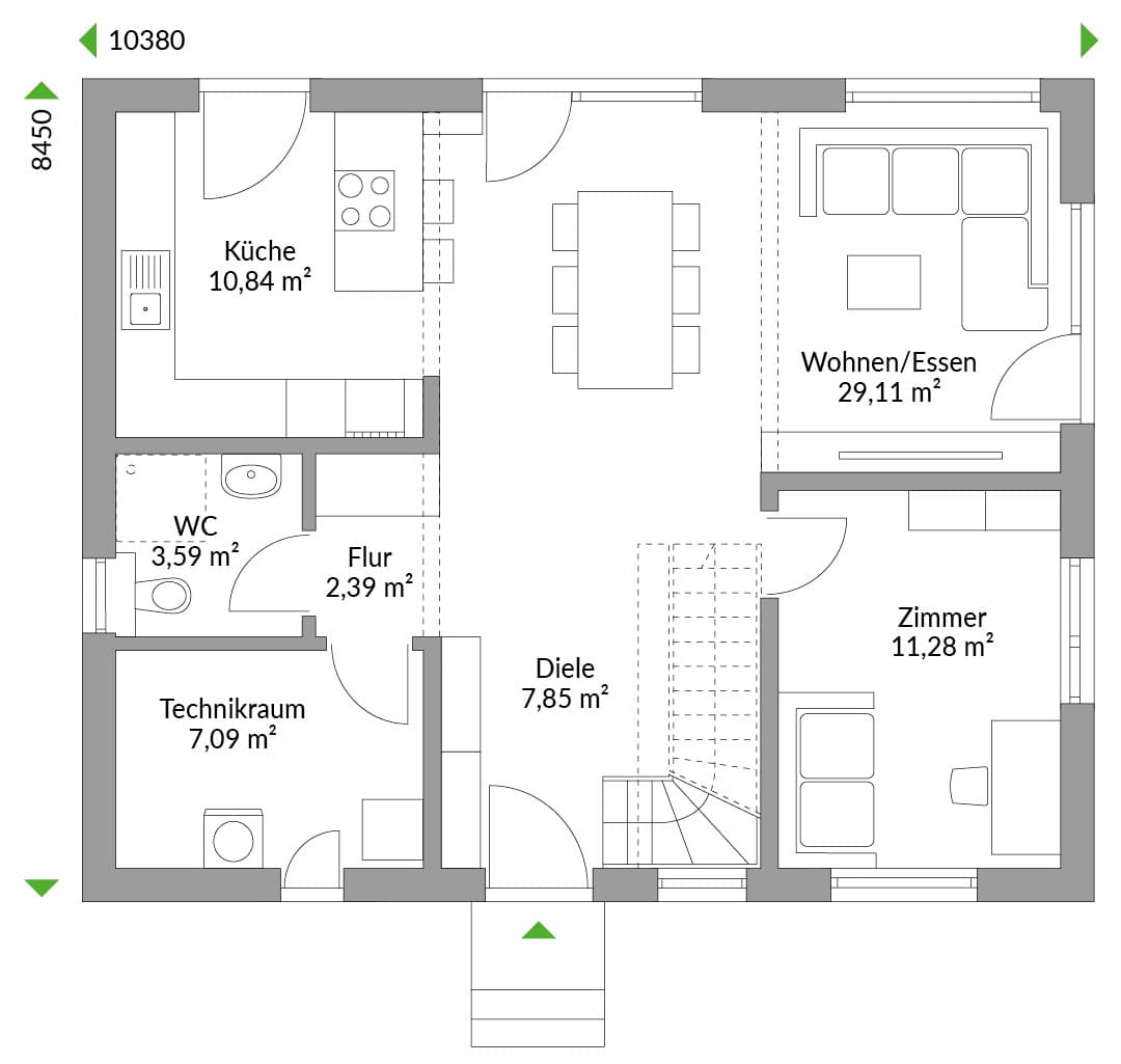 Die Grundrisse im Erdgeschoss variieren, bieten jedoch immer einen großzügigen Wohn- und Essbereich, der das Herzstück des Hauses darstellt, eine gut dimensionierte Küche, ein separates Gäste-WC und einen Technikraum im Erdgeschoss. Im Obergeschoss befinden sich gleich vier Schlafzimmer und ein großzügiges Wannenbad mit Dusche für private Momente für jedes Familienmitglied. Für die Eltern gibt es im Schlafzimmer ein besonderes Bonbon - eine begehbare Ankleide.