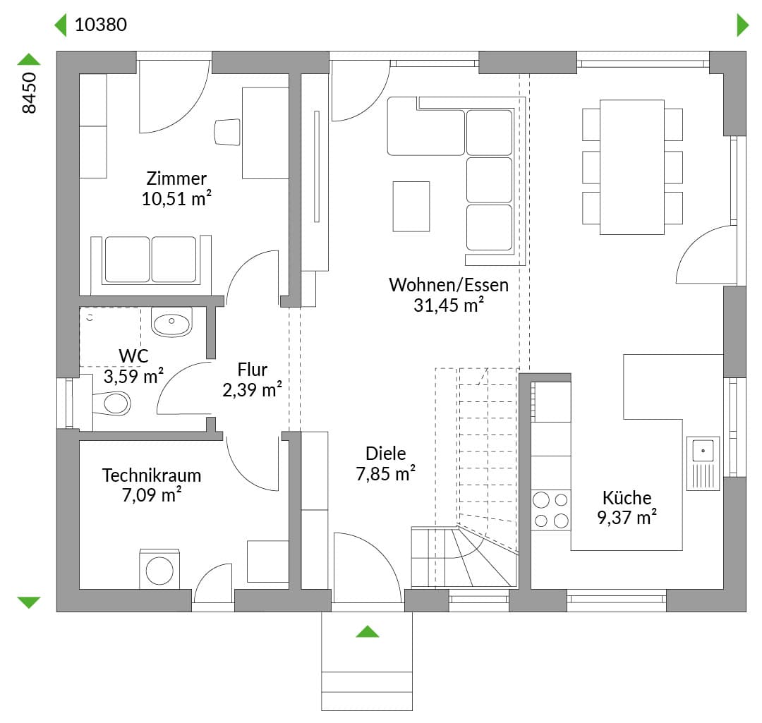 Die Grundrisse im Erdgeschoss variieren, bieten jedoch immer einen großzügigen Wohn- und Essbereich, der das Herzstück des Hauses darstellt, eine gut dimensionierte Küche, ein separates Gäste-WC und einen Technikraum im Erdgeschoss. Im Obergeschoss befinden sich gleich vier Schlafzimmer und ein großzügiges Wannenbad mit Dusche für private Momente für jedes Familienmitglied. Für die Eltern gibt es im Schlafzimmer ein besonderes Bonbon - eine begehbare Ankleide.