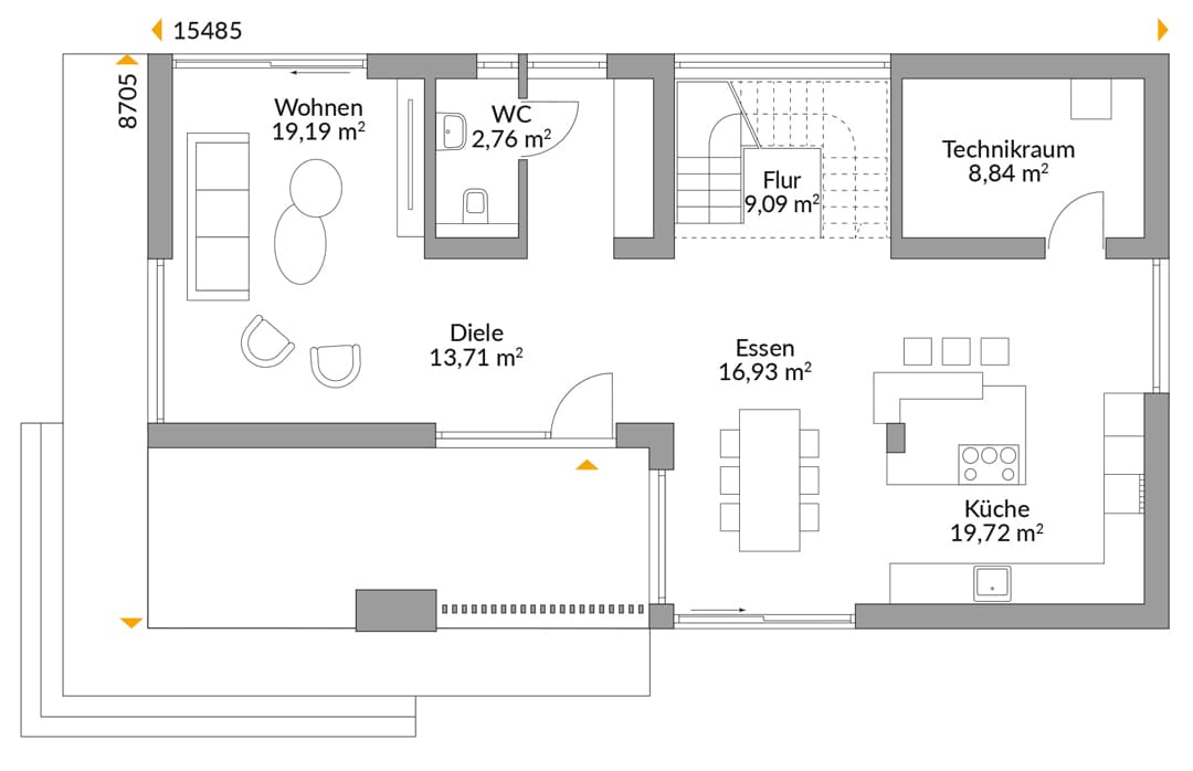 200 Quadratmeter – hier hat eine vierköpfige Familie viel Platz zum Leben. Weitläufig und mit schönen Sichtachsen präsentiert sich das Erdgeschoss des Modulhauses mit großer Küche, anliegendem Essplatz und einer abgeschirmten Lounge-Ecke. Vor gläserner Kulisse „schwebt“ die grazile Treppe. Im Obergeschoss genießen die Eltern ihren privaten Bereich mit Schlafzimmer, Ankleide und En-Suite-Bad. Zu den zwei Kinderzimmern gehört ein weiteres Bad. Der hohen Kniestock und die Öffnung der Räume bis unter den First sorgen für Platz und einen luftigen Eindruck. Der 33m2 große Balkon ist über den Flur zugänglich.