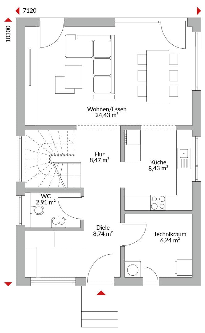 Eineinhalbgeschossiges Haus mit vier Zimmern, Ankleide, offener Küche, Bad, Gäste-WC, Diele, Flur und Technikraum. Satteldach mit 30° Dachneigung, Kniestock 1,75 m.