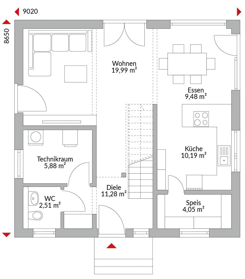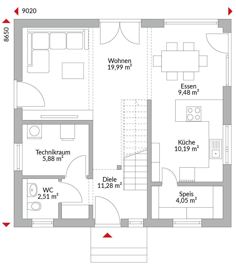 Eineinhalbgeschossiges Haus mit vier Zimmern, Ankleide, Küche, Speisekammer, 2 Bädern, Gäste-WC, Diele, Flur und Technikraum. Satteldach mit 30° Dachneigung, Kniestock 1,50 m.