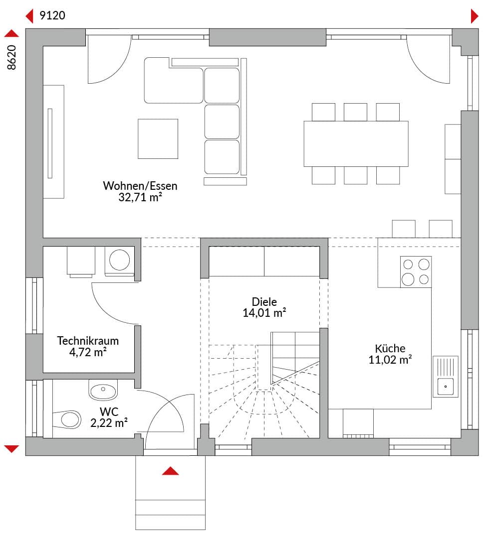 Eineinhalbgeschossiges Haus mit 4 Zimmern, offener Küche, Bad, Gäste-WC, Diele, Flur und Technikraum. Satteldach mit 40° Dachneigung. Kniestock 0,75 m.