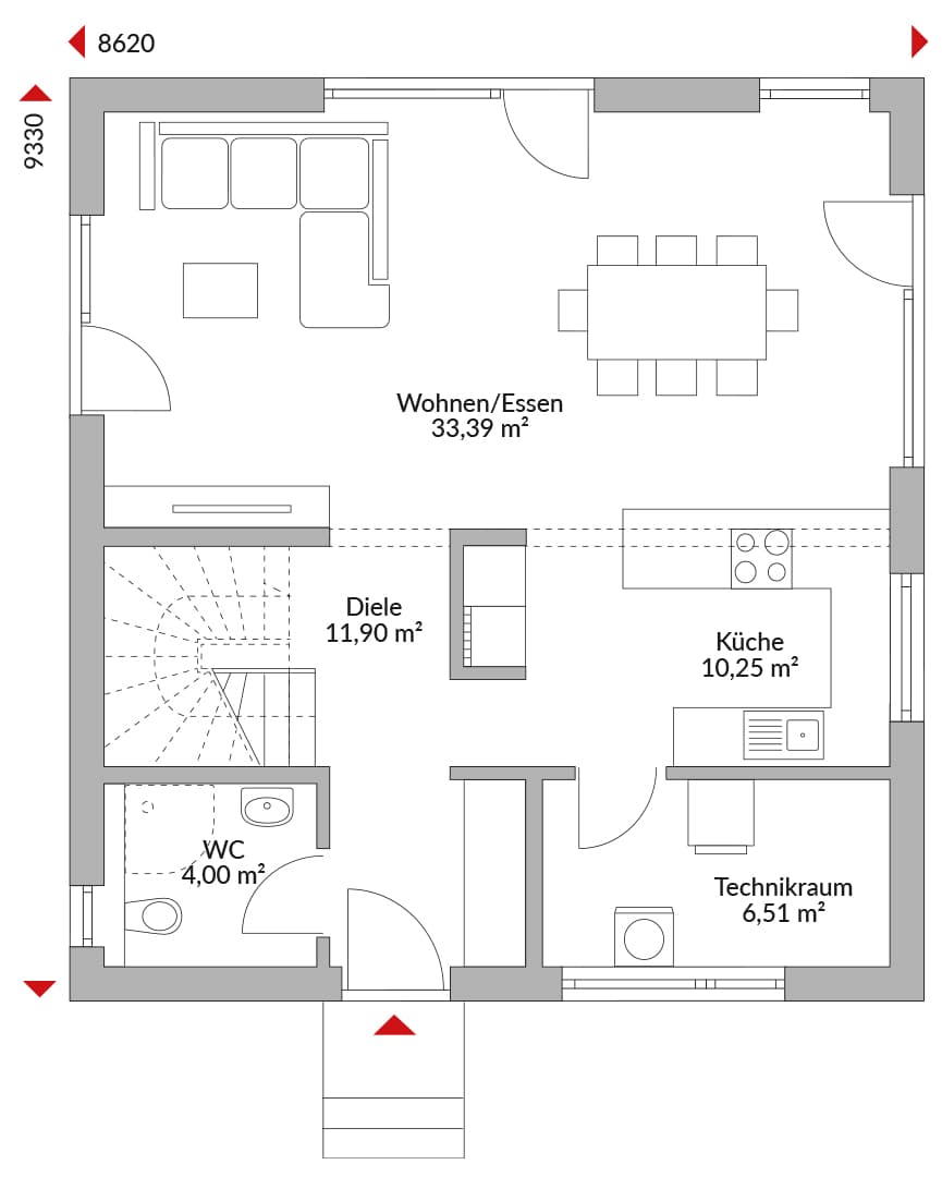 Eineinhalbgeschossiges Haus mit vier Zimmern, offener Küche, Bad, Gäste-WC, Technikraum und Diele, Satteldach mit 40° Dachneigung, Kniestock 0,75 m.