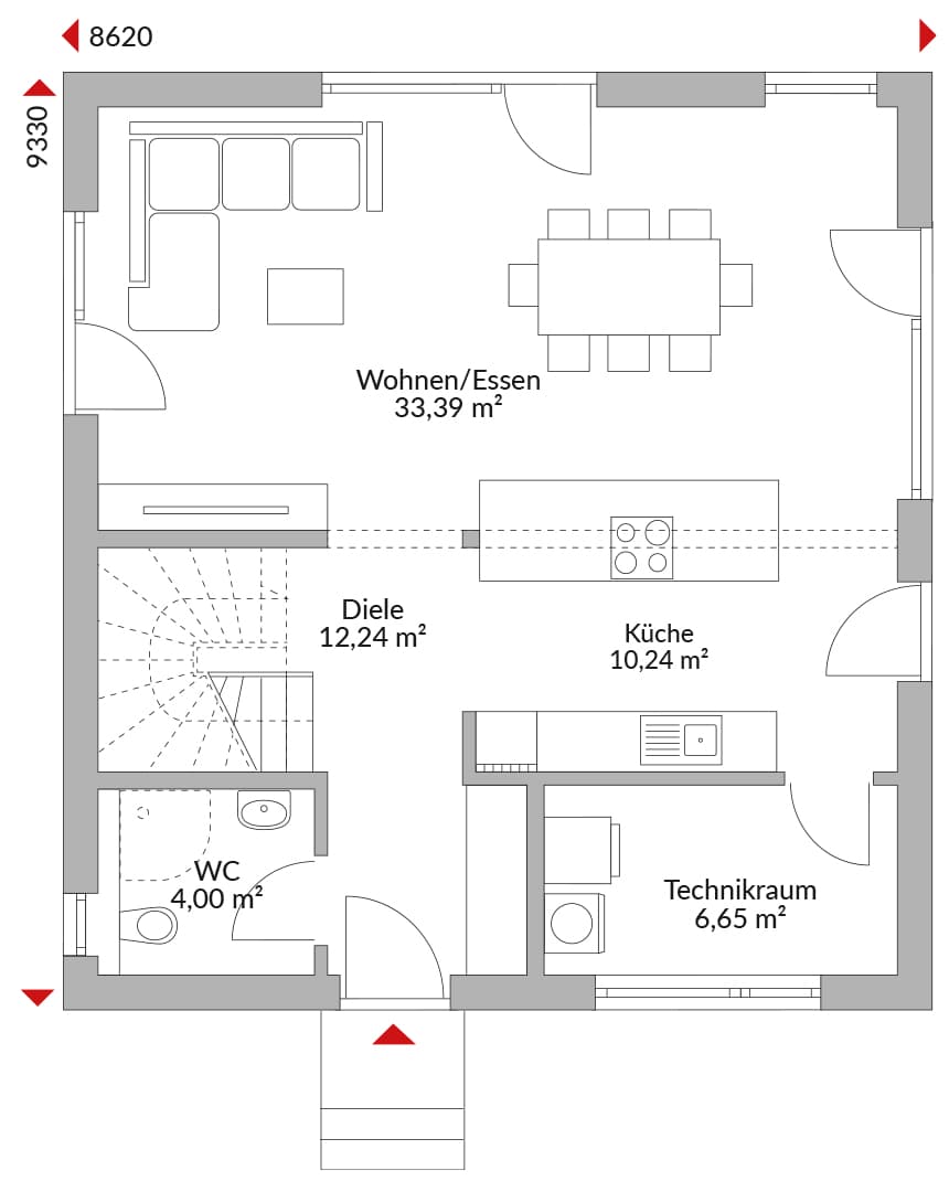 Eineinhalbgeschossiges Haus mit einem Zwerchgiebel, vier Zimmern, offener Küche, Bad, Gäste-WC, Technikraum und Diele, Satteldach mit 40° Dachneigung (Zwerchgiebeldach 35°), Kniestock 0,75 m.