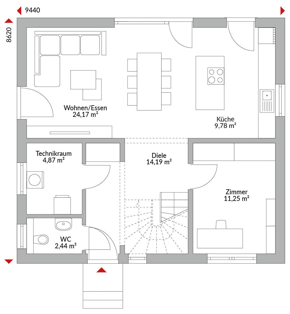 Eineinhalbgeschossiges Haus mit 5 Zimmern, offener Küche, Bad, Gäste-WC, Diele, Flur und Technikraum. Satteldach mit 40° Dachneigung. Kniestock 0,75 m.