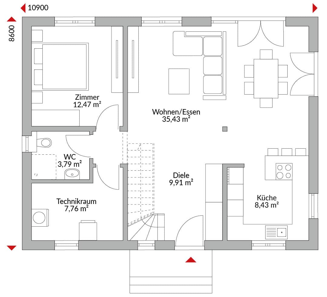 Eineinhalbgeschossiges Haus mit vier Zimmern, offener Küche, Bad, Gäste-WC, Technikraum, Diele und Flur. Satteldach mit 45° Dachneigung, Kniestock 0,75 m.