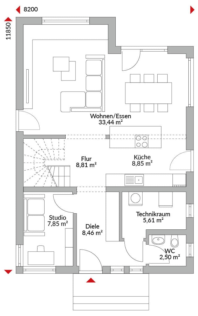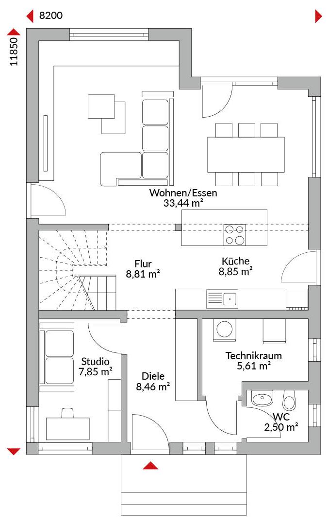 Eineinhalbgeschossiges Haus mit 5 Zimmern, Ankleide, offener Küche, Bad, Gäste-WC, Diele, Flur und Technikraum. Satteldach mit 30° Dachneigung, Kniestock 1,75 m.