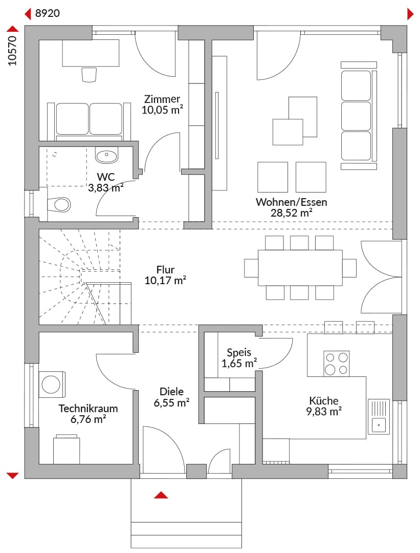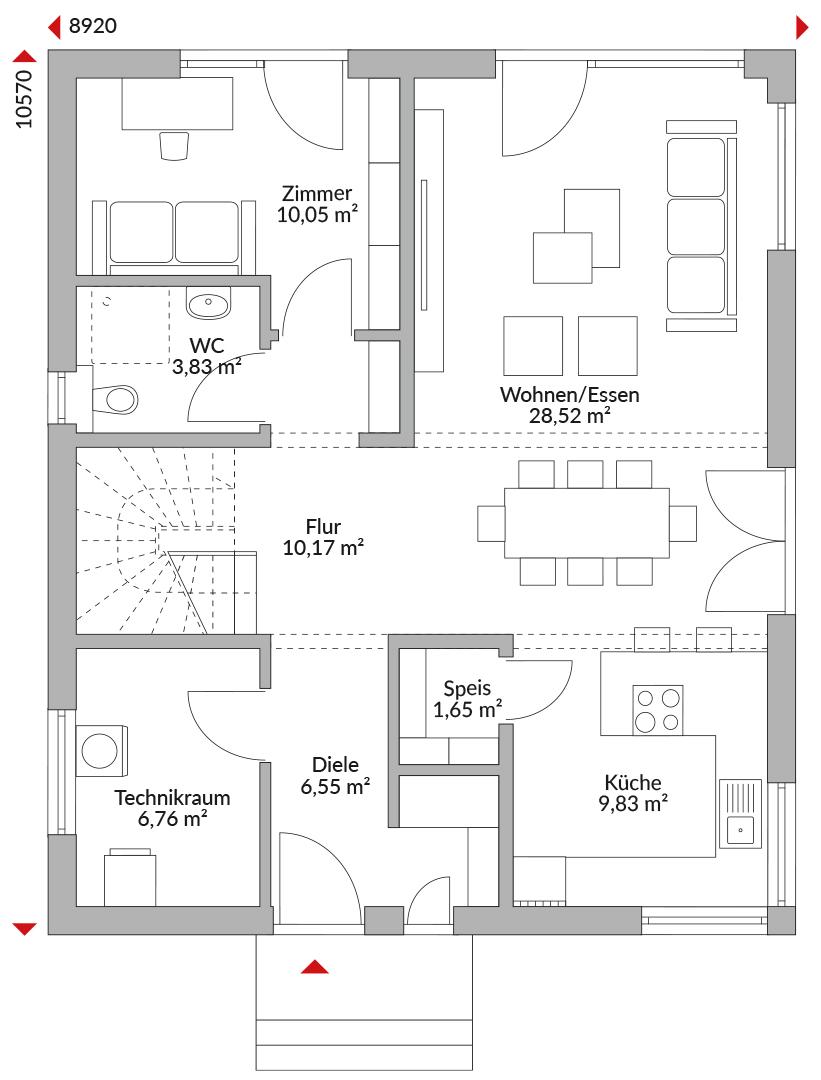 Eineinhalbgeschossiges Haus mit fünf Zimmern, einer Ankleide, offener Küche, Speisekammer, Bad, Gäste-WC, Technikraum, Diele und Flur, Satteldach mit 40° Dachneigung, Kniestock 0,75 m.