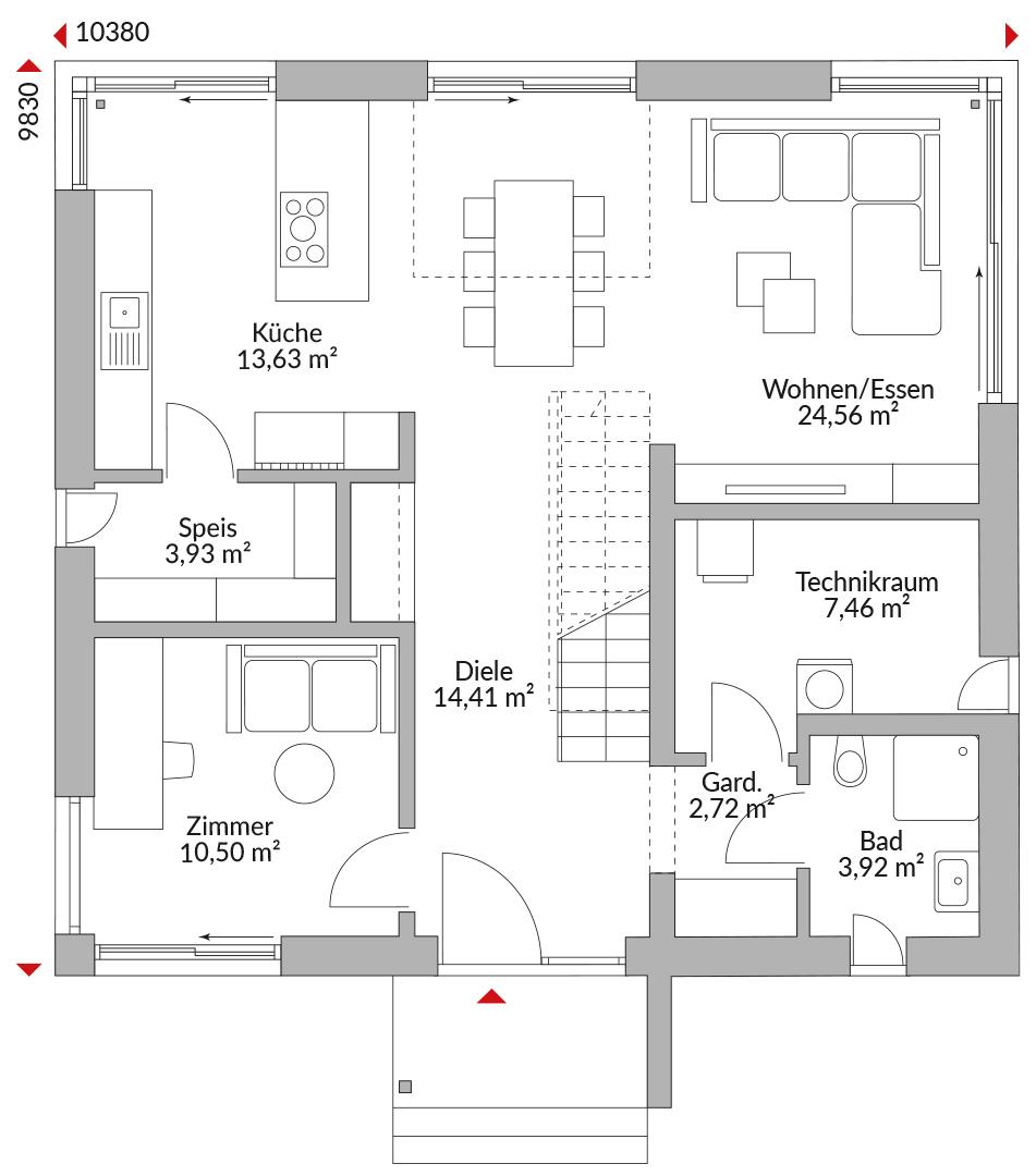 Eineinhalbgeschossiges Haus mit Eingangsüberdachung der höheren Haustür und drei Zimmern im Obergeschoss. Schlafzimmer mit begehbarer Ankleide und Masterbad inkl. Doppelwaschbecken, Badewanne und Dusche, geräumiger Flur mit heller Leseecke, zweites Bad im OG mit Dusche. Bodentiefe Verglasung mit französischen Balkonen aus Glas. Separates Mehrzweckzimmer mit Eckfensterlösung im Erdgeschoss. Das höhere Erdgeschoss mit erhöhter bodentiefer im Wohnzimmer Eckverglasung ist als offene Küche / Wohnen/ Essen mit Schiebetüren zur Terrasse konzipiert. Speisekammer, Technikraum und Diele mit Garderobe, Gäste-WC mit Dusche Satteldach mit breiter Traufe von 60 cm, 40° Dachneigung, Kniestock 1,25 m.