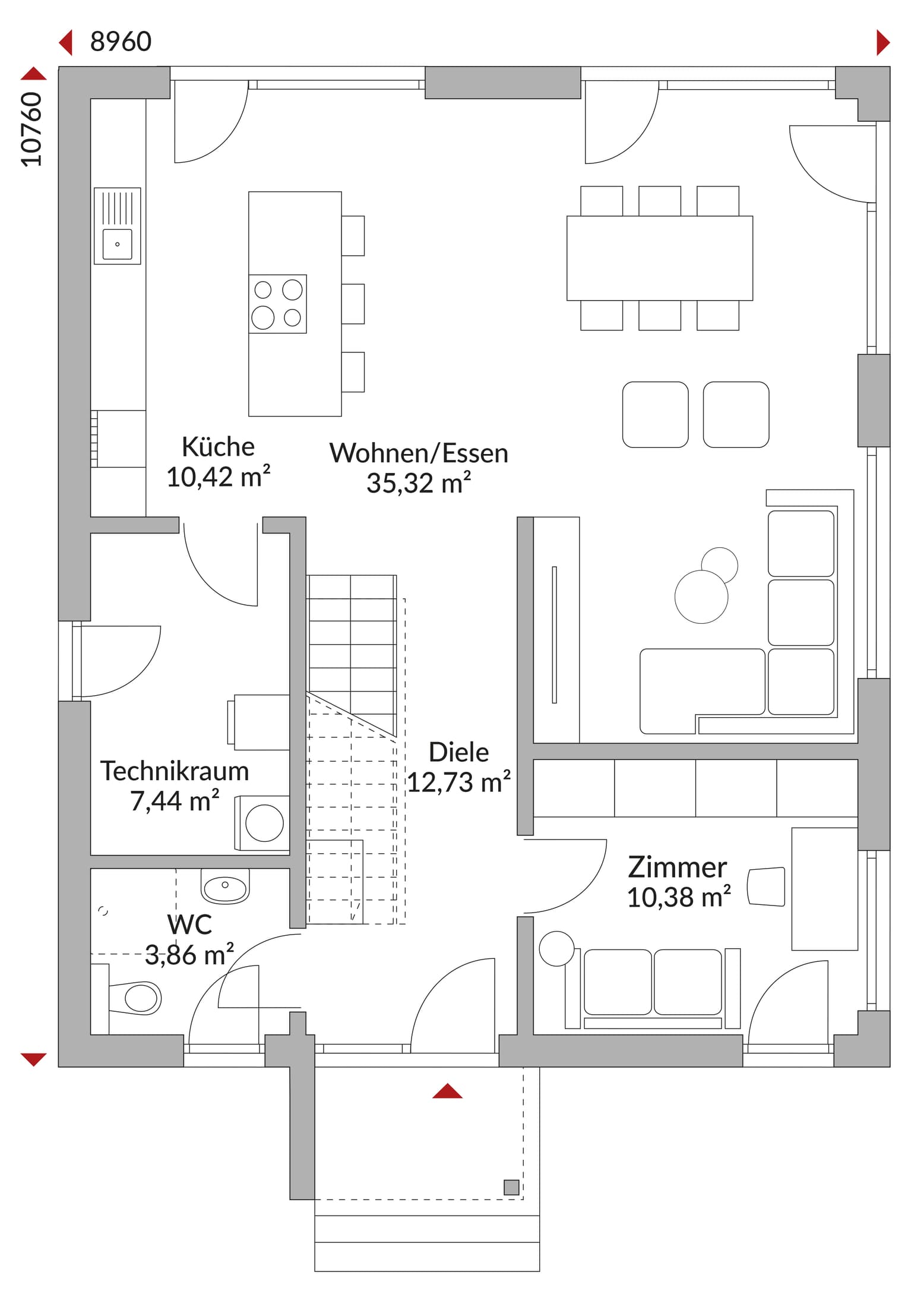 Herzstück im Erdgeschoss ist der offen geplante Bereich aus Wohnen und Essen mit 35,32 m²: hier ist Platz für lange Tischrunden, Spielzeug auf dem Boden und trotzdem genügend Luft im Raum. Die Küche ist direkt angebunden und bleibt mit ihrer eigenen Zone angenehm „bei sich“. Praktisch im Hintergrund: Technikraum und separates WC, genau dort, wo sie gebraucht werden. Oben verteilt sich das Familienleben auf vier Zimmer – vom Elternzimmer bis zum Kinderzimmer, Hobbyraum oder Ankleide-Plus. Das große Bad sorgt für entspanntere Morgen, der breite Flur nimmt Bewegung auf, ohne Enge zu erzeugen.