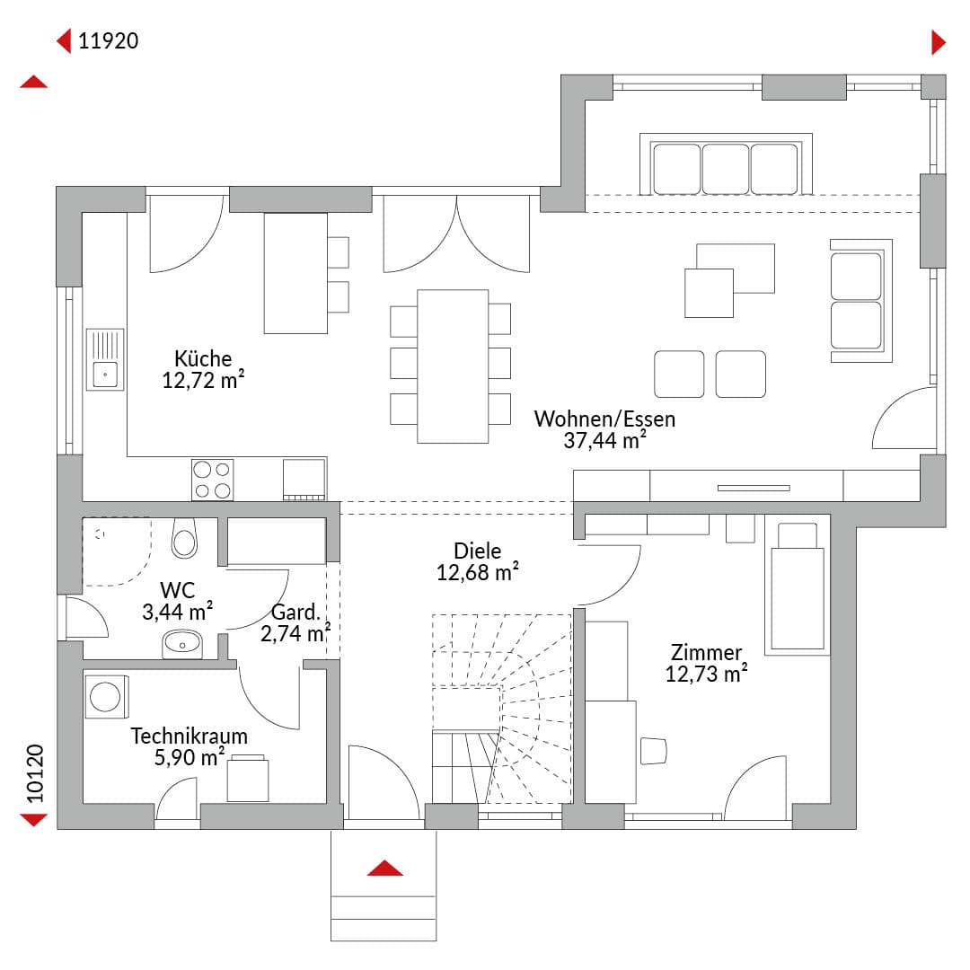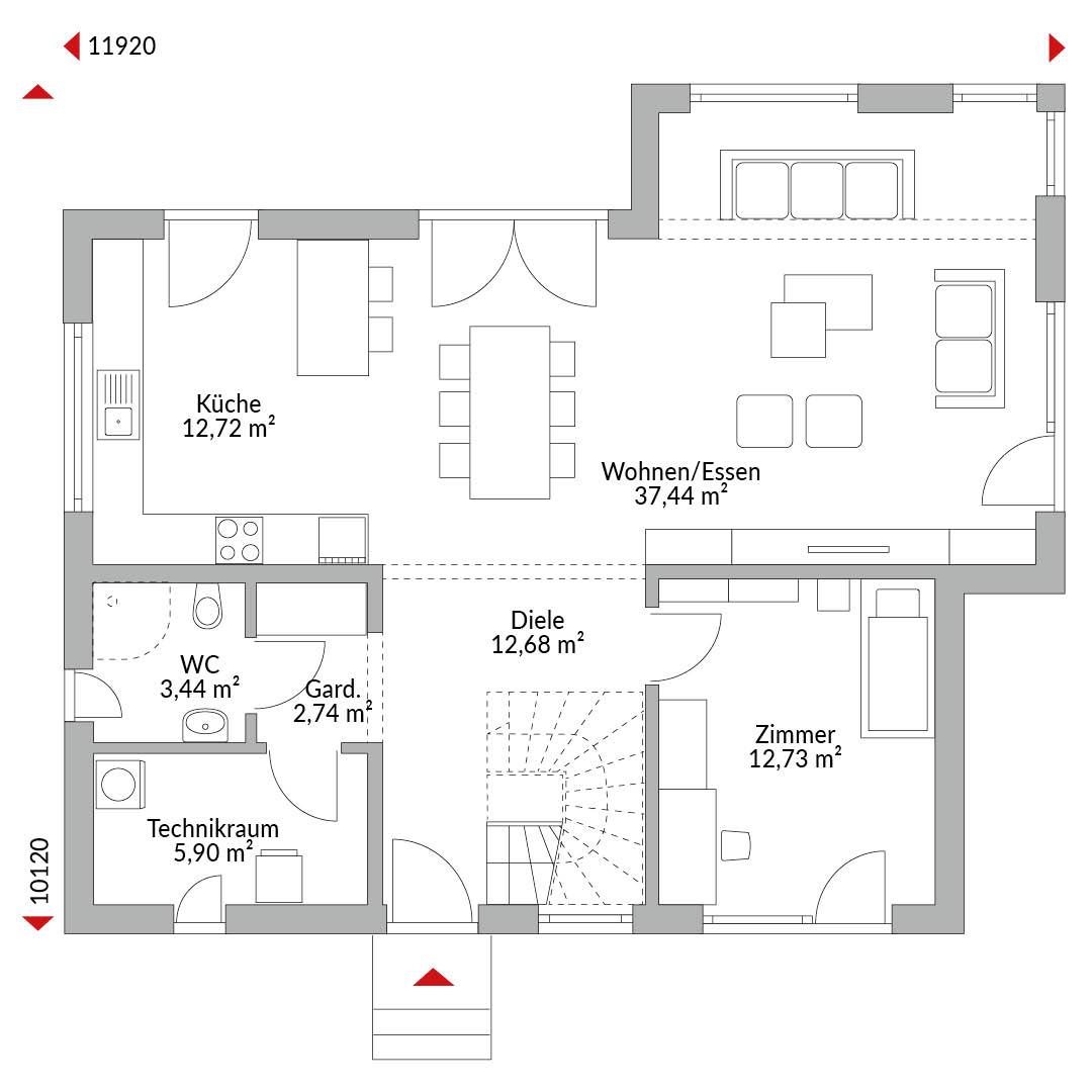Haus mit sechs Zimmern, offener Küche, Bad, Gäste-WC, Technikraum und Diele, Satteldach mit 25° Dachneigung, Kniestock 1,75 m.