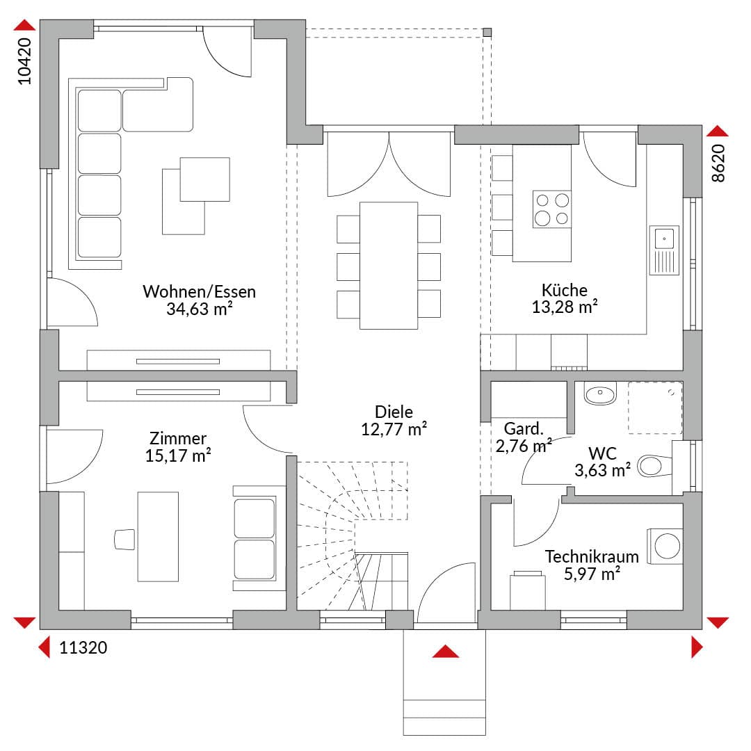 Eineinhalbgeschossiges Drei-Giebel-Haus mit fünf Zimmern, Ankleide, offener Küche, Bad, Gäste-WC, Diele, Flur, und Technikraum. Satteldach mit 40° Dachneigung. Kniestock 0,75 m. Terrassenüberdachung.