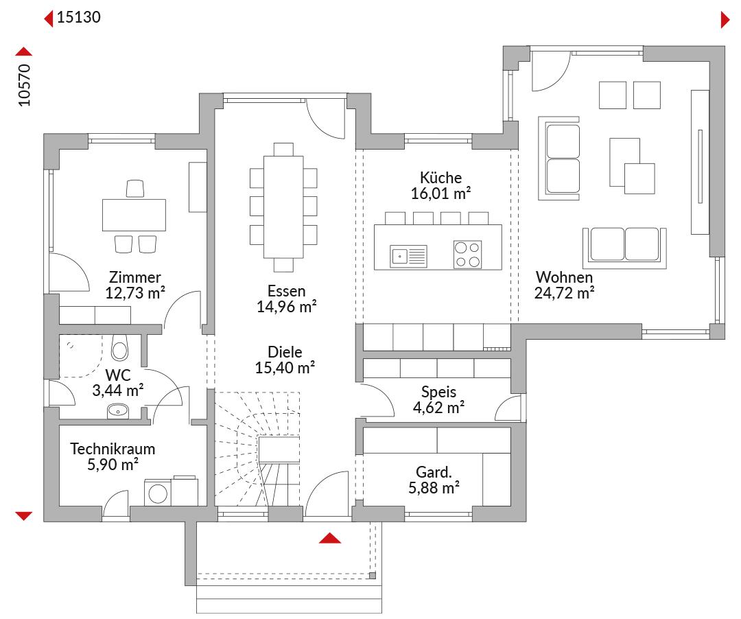 Haus mit fünf Zimmern und einem Studio, Flachdachgiebel, Anbau, Attika-Eingangsüberdachung, großer Garderobe, offener Küche, Speisekammer, Bad, Gäste-WC, Technikraum und Diele, Satteldach mit 25° Dachneigung (Flachdachgiebelgiebel 0°), Kniestock 1,75 m.