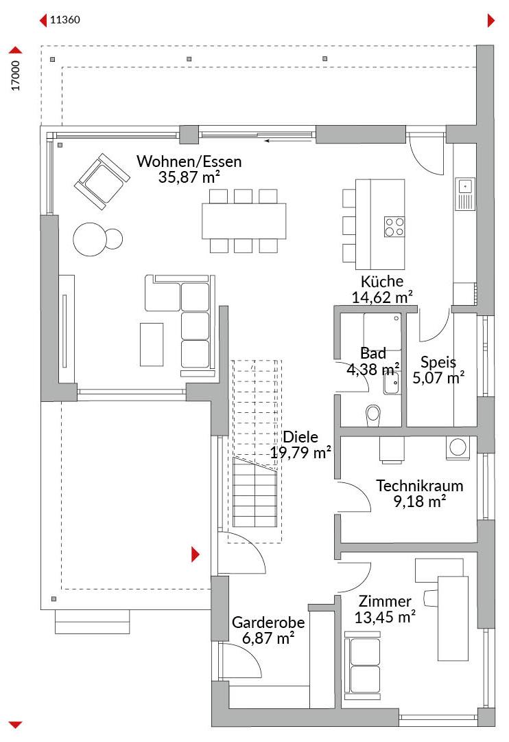 Zweigeschossiges Haus mit rundumlaufender Terrassenüberdachung sowie breiter Eingangsüberdachung der höheren Haustür. Drei Zimmer im Obergeschoss. Hauptschlafzimmer mit begehbarer Ankleide und Masterbad mit freistehender Badewanne, Doppelwaschbecken und Dusche, zweites Bad im OG mit Dusche, separates Mehrzweckzimmer im Erdgeschoss. Das höhere Erdgeschoss mit erhöhter bodentiefer im Wohnzimmer Eckverglasung ist als offene Küche / Wohnen/ Essen mit Schiebetüren zur Terrasse konzipiert. Speisekammer, Technikraum und Diele mit Garderobe, Gäste-WC mit Dusche, Satteldach mit 36° Dachneigung, Kniestock 2,10 m.