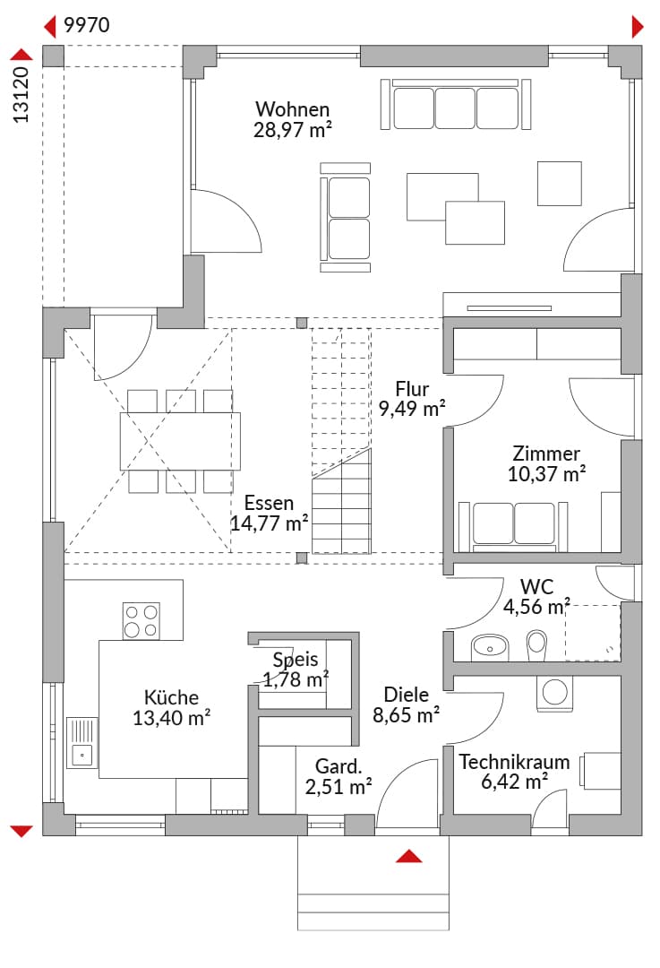 Eineinhalbgeschossiges Haus mit sechs Zimmern, Ankleide, Galerie, offener Küche, Speisekammer, Bad, Gäste-WC, Garderobe, Technikraum und Diele, Terrassenüberdachung, Satteldach mit 35° Dachneigung, Kniestock 1,00 m.