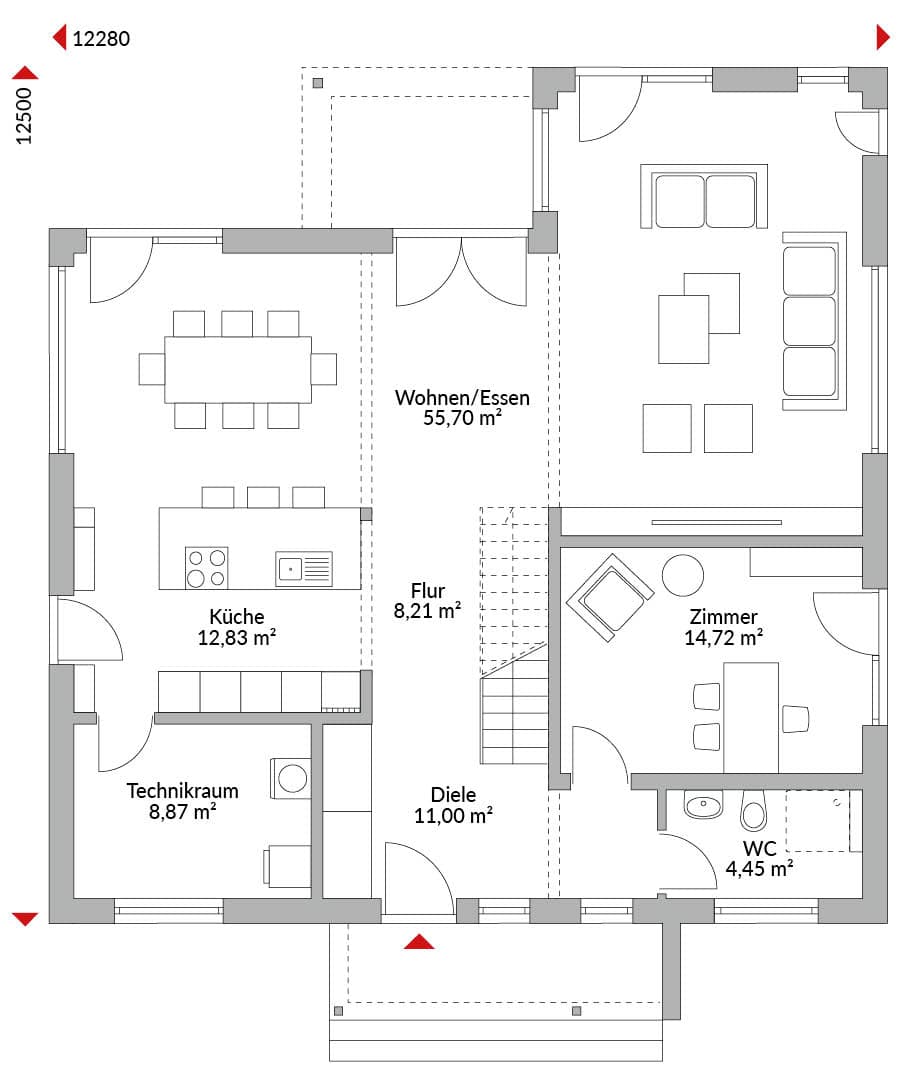 Eineinhalbgeschossiges Haus mit sechs Zimmern, zwei Ankleiden, offener Küche, , Bad, Gäste-WC, Technikraum, Diele und Flur, Satteldach mit 25° Dachneigung, Kniestock 1,75 m.