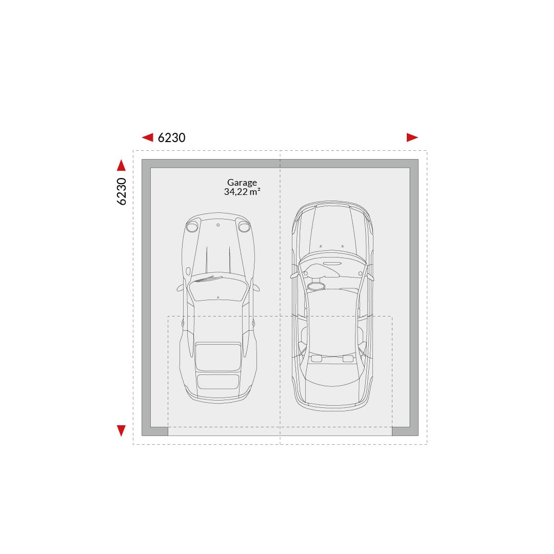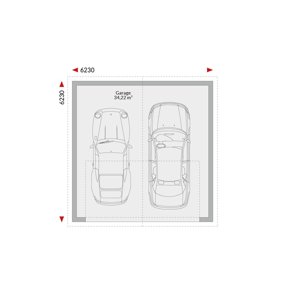 Doppelgarage mit Satteldach Grundfläche: 34,22 m² Außenmaße: 6,23 m x 6,23 m Tor giebelseitig
