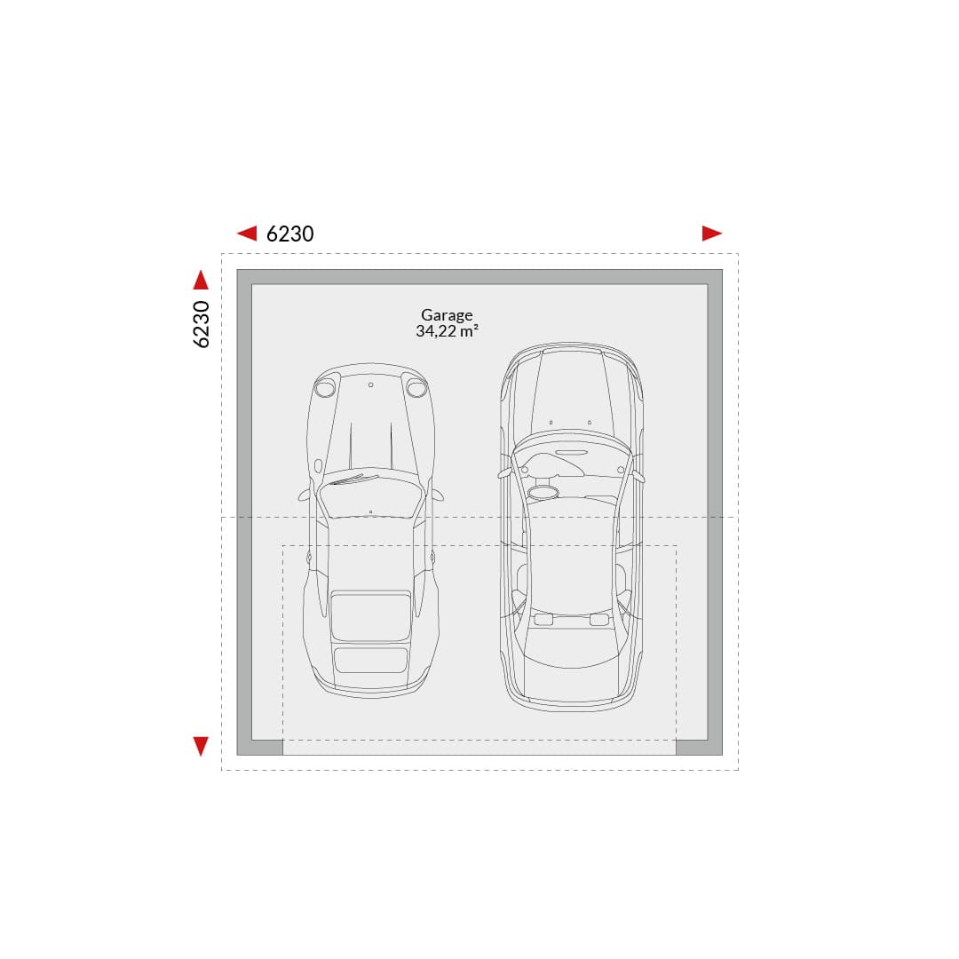 Doppelgarage mit Satteldach Grundfläche: 34,22 m² Außenmaße: 6,23 m x 6,23 m Tor traufseitig